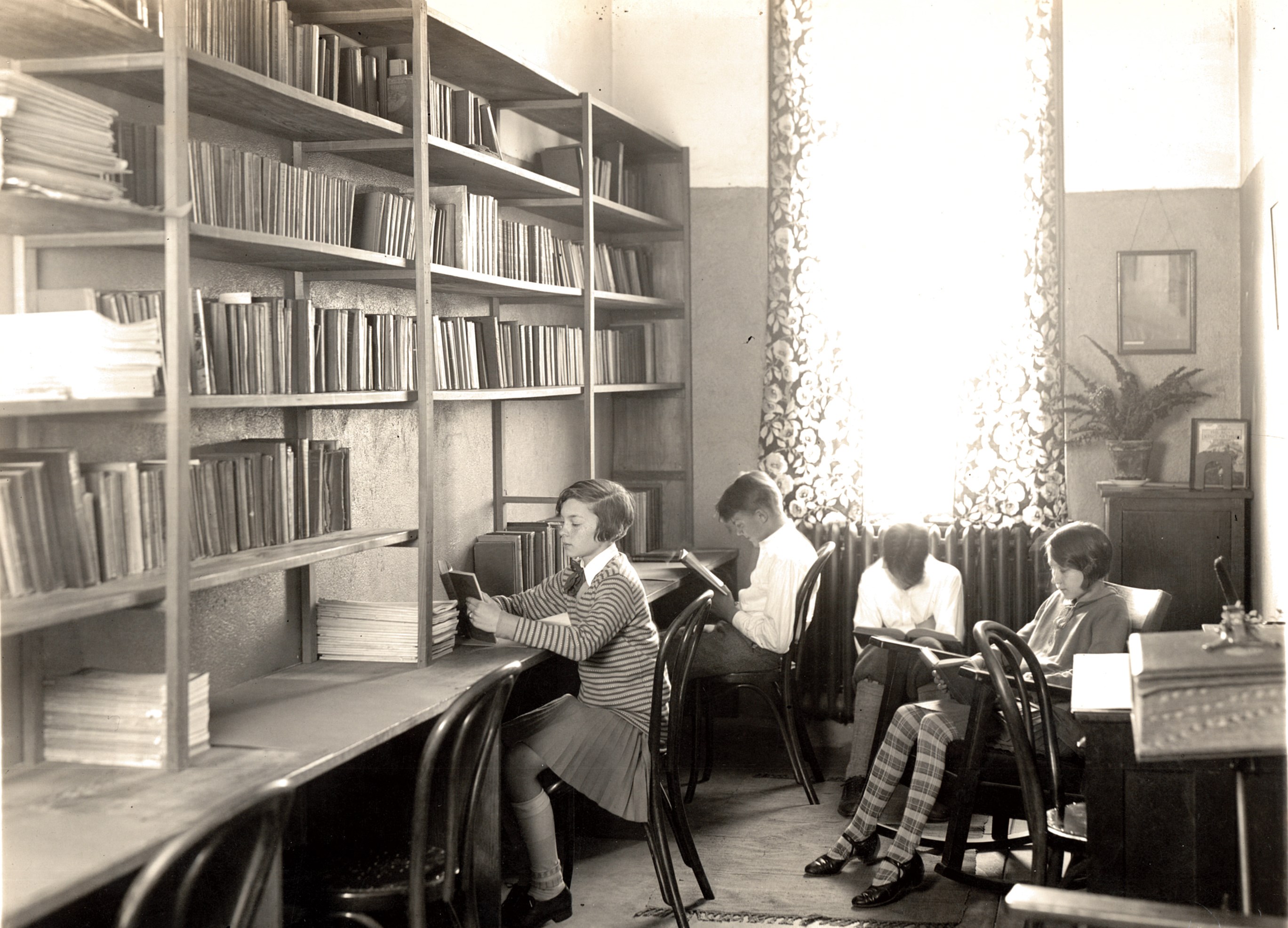Back of Photo: "Morris Plans School Library. Worker aids this service." Date unknown.