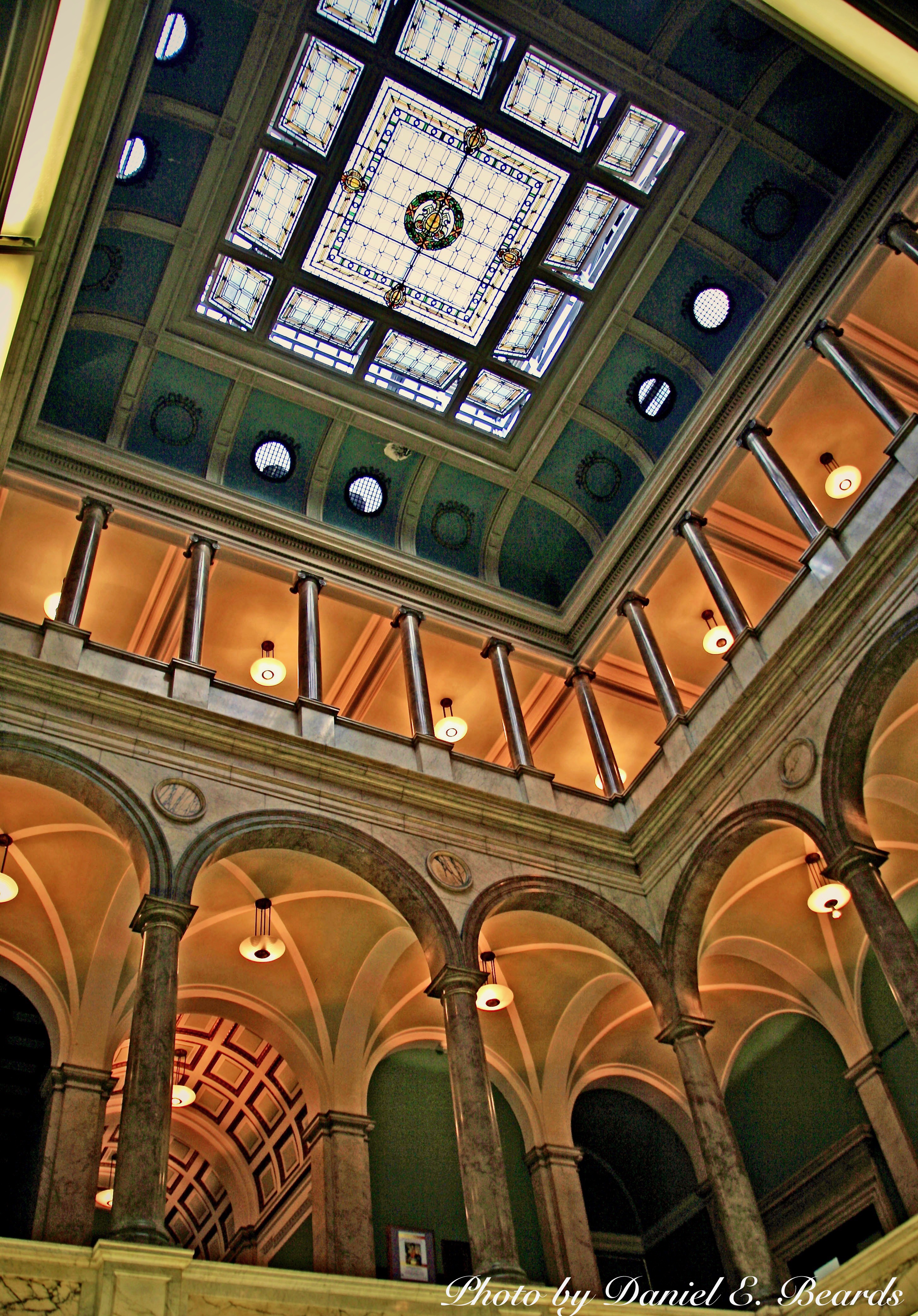 | dc.description | As visitors entered the Library through the arched doorway, they passed through a marble�clad vestibule into an illuminated and spacious central court. The atrium featured vaulted ceilings covered with mosaics and a plaster frieze and Roseal, Carrara, Pavanazzo, and gray marble columns, wainscoting, flooring, medallions, panels, and stairways. Note the beautiful stained glass window. | |
