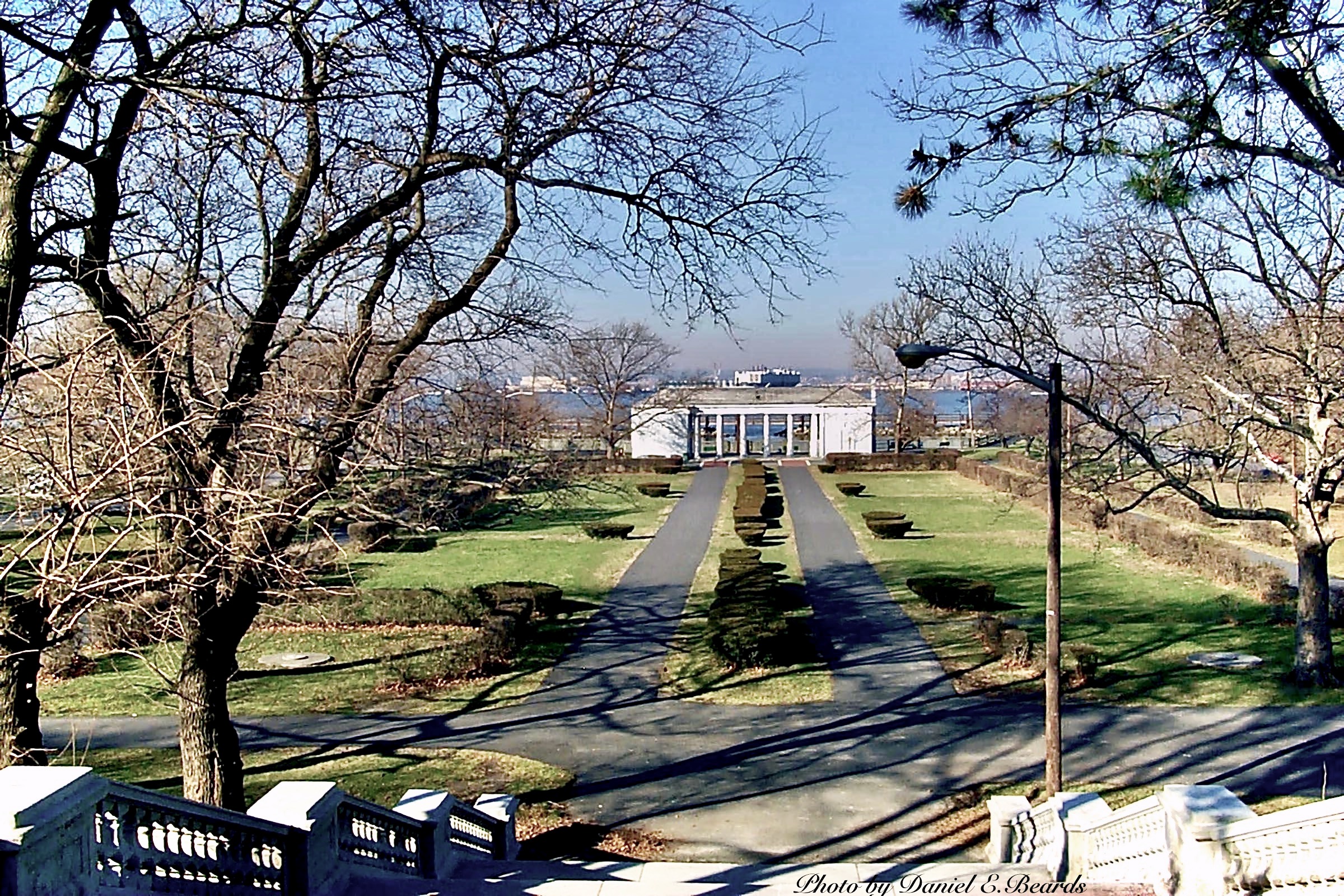 This picture was taken from the top of the steps in Stephen R. Gregg Park looking toward the lower level of the park and Newark Bay