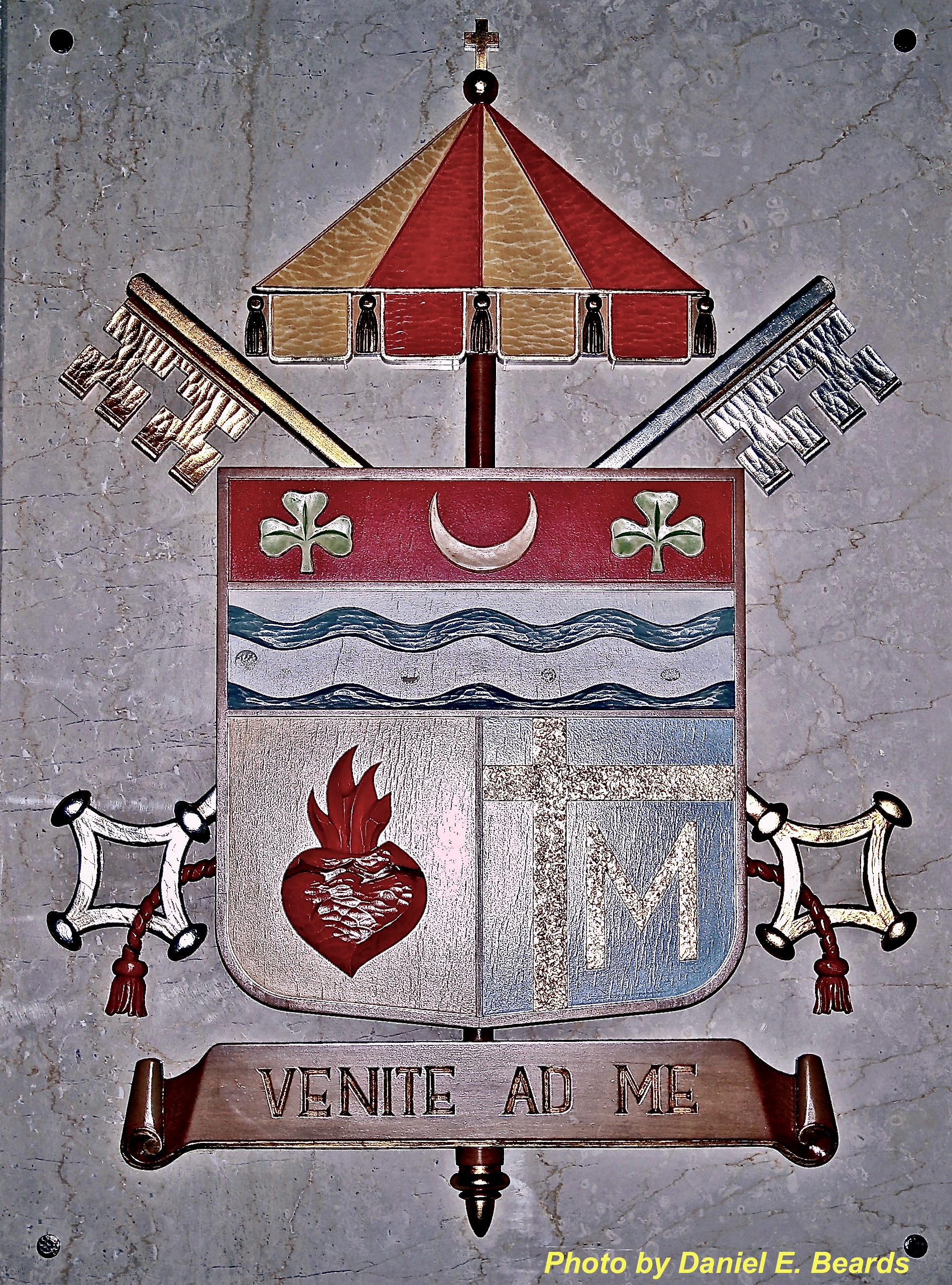 The Coat of Arms of The Cathedral of the Sacred Heart of Newark, NJ, 55 Coat of Arms_fotor.jpeg, Located in the Narthex of the cathedral is the Basilica's Coat of Arms. It is based on the Arms of Newark in Nottinghamshire England, which is the origin of the name Newark., The Crescent Moon is the symbol of the Immaculate Conception. The shamrocks honor St. Patrick, patron saint of the pro-cathedral., The color red is a symbol of the Blood of Christ while the blue and silver waves represent the rivers that flow through the archdiocese., The Sacred Heart burning with love for all people is on a field of gold while the letter M represents Our Lady and is taken from the Coat of Arms of John Paul II . It serves as an indication of the bond that exists between the Church of Rome and the church of Newark., The crossed keys are symbols of the Papacy. The Ombellrellino, is a papal emblem that signifies that the church is a Basilica and the words inscribed at the Bottom are from Matthew 11:28-29, "Come to Me all who labor and are heavy burdened and I will giBasilica Cathedral of the Sacred Heart, Basilica, Cathedral, Catholic Church, Catholic Cathedral, Catholic Basilica, Sacred Heart Cathedral, Gothic Architecture, Gothic Style Church, French Gothic Architecture, Archdiocese of Newark, Catholic Archdiocese, Diocese, Newark, Essex County, New Jersey, NJ, Jersey, The Garden State