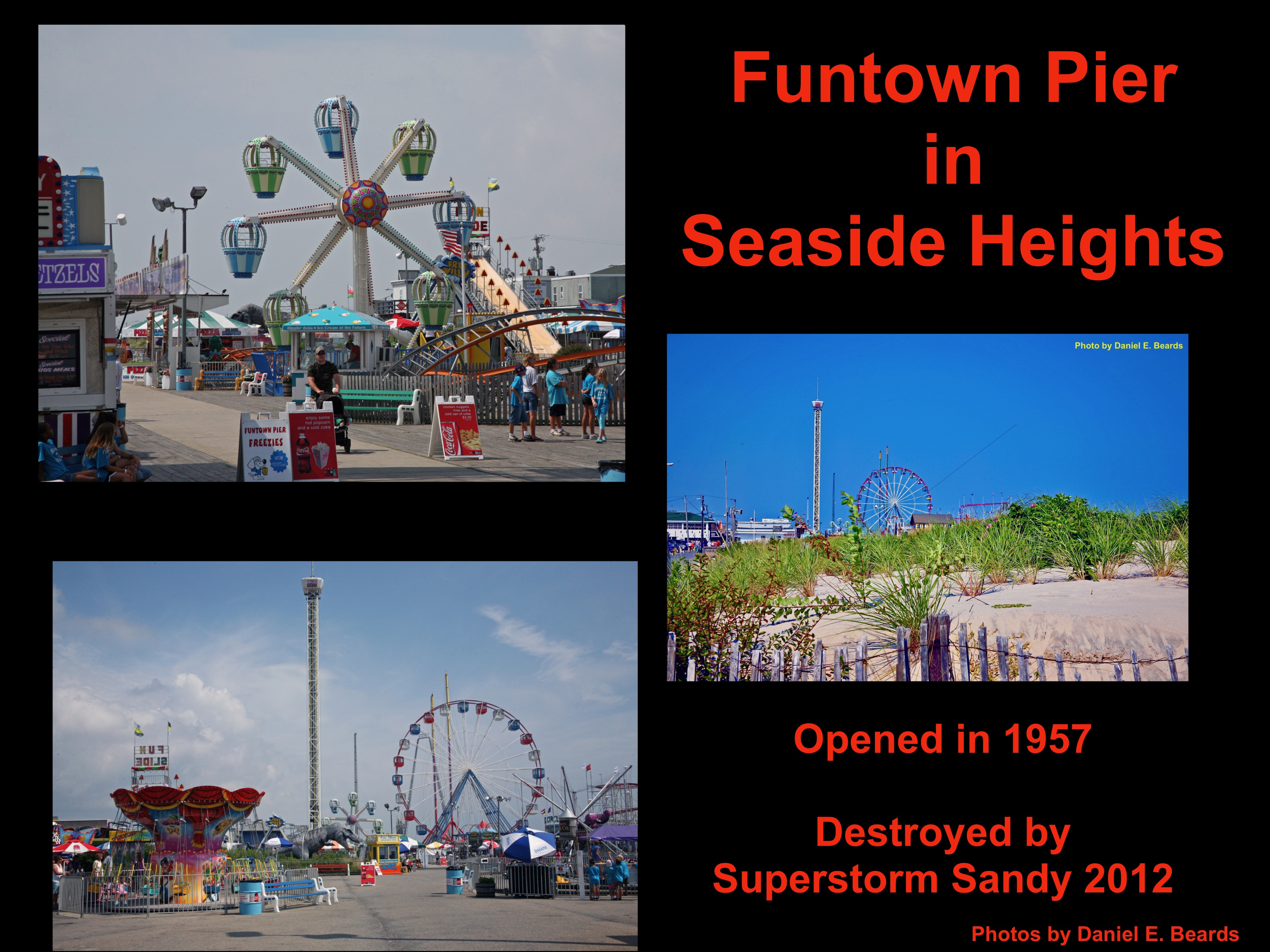 Funtown Pier suffered major damage as a result of Superstorm Sandy. About 50 feet of the Funtown Pier collapsed and washed up on the beach as a pile of wooden beams and twisted fencing. If that wan't enough, on September 12, 2013 a teal arm fire occurred on the pier and boardwalk destroying more than 50 businesses.
