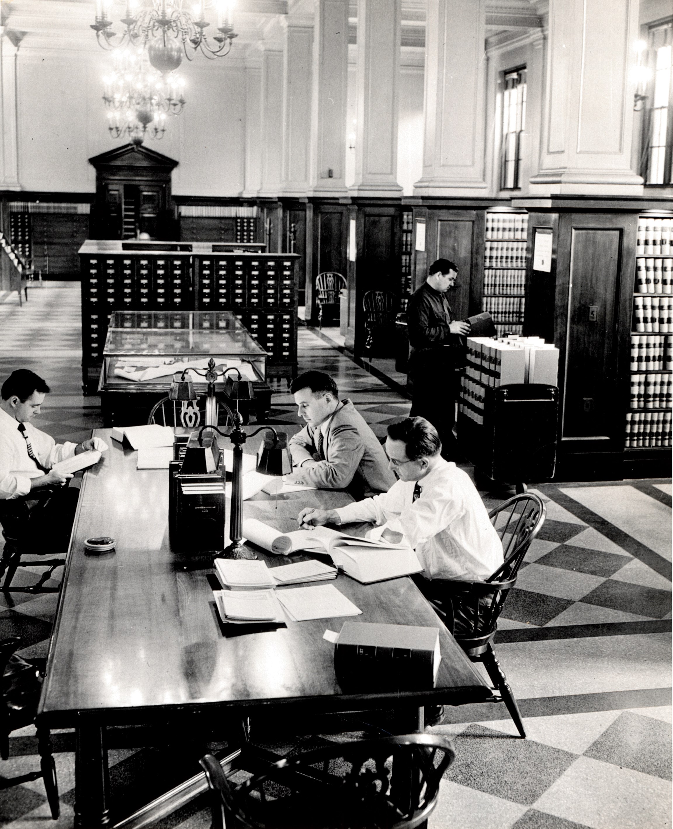 The New Jersey State Library was located in the State House Annex in 1949. Back of Photo: "State Library & Law Library. Joseph Pizzullo (Legislative Reference Assistant),extreme right at book truck. Gentlemen at tables - patrons. 1949."