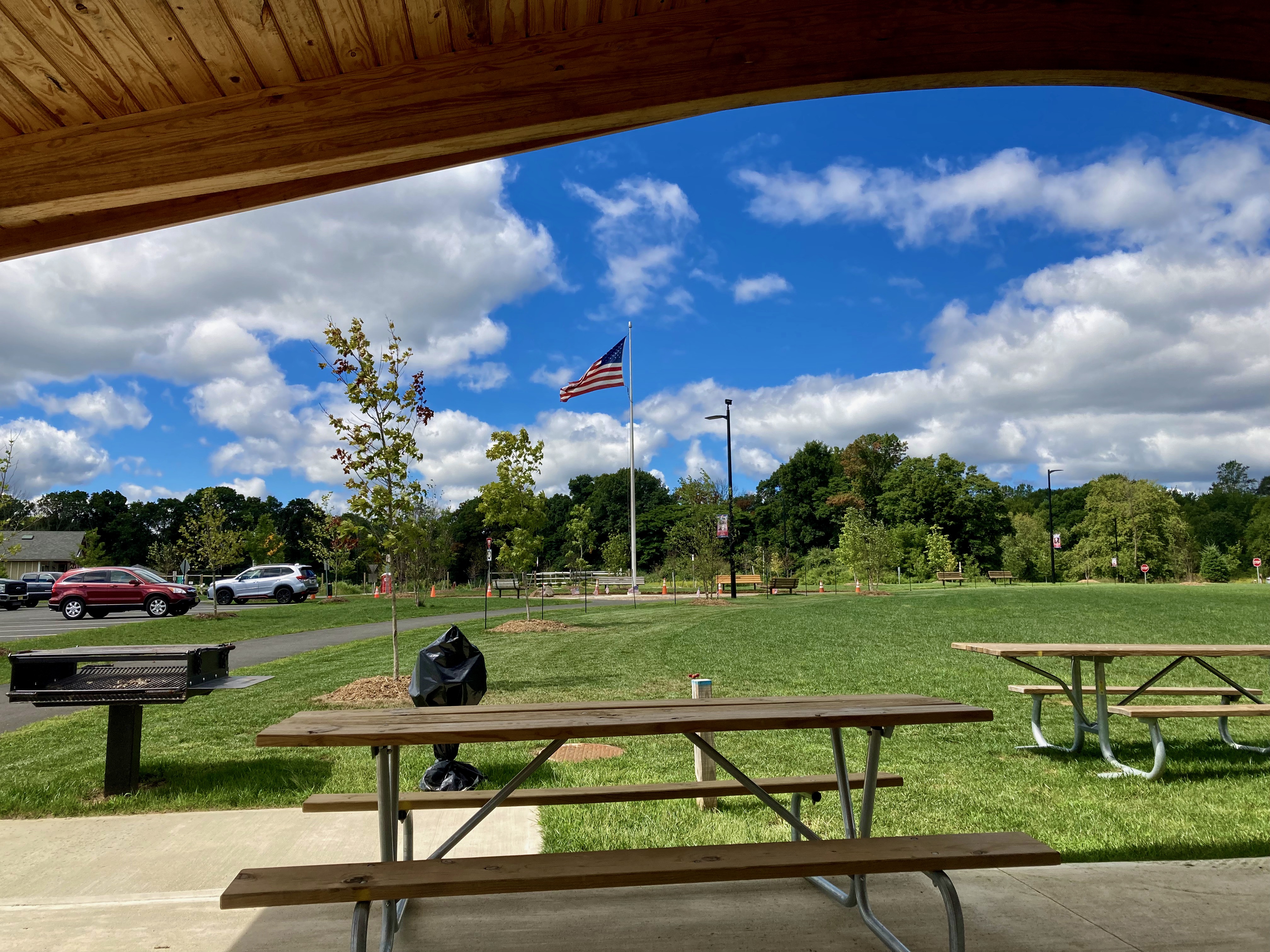 This picture was taken from inside the pavilion in Veteran Community Park.