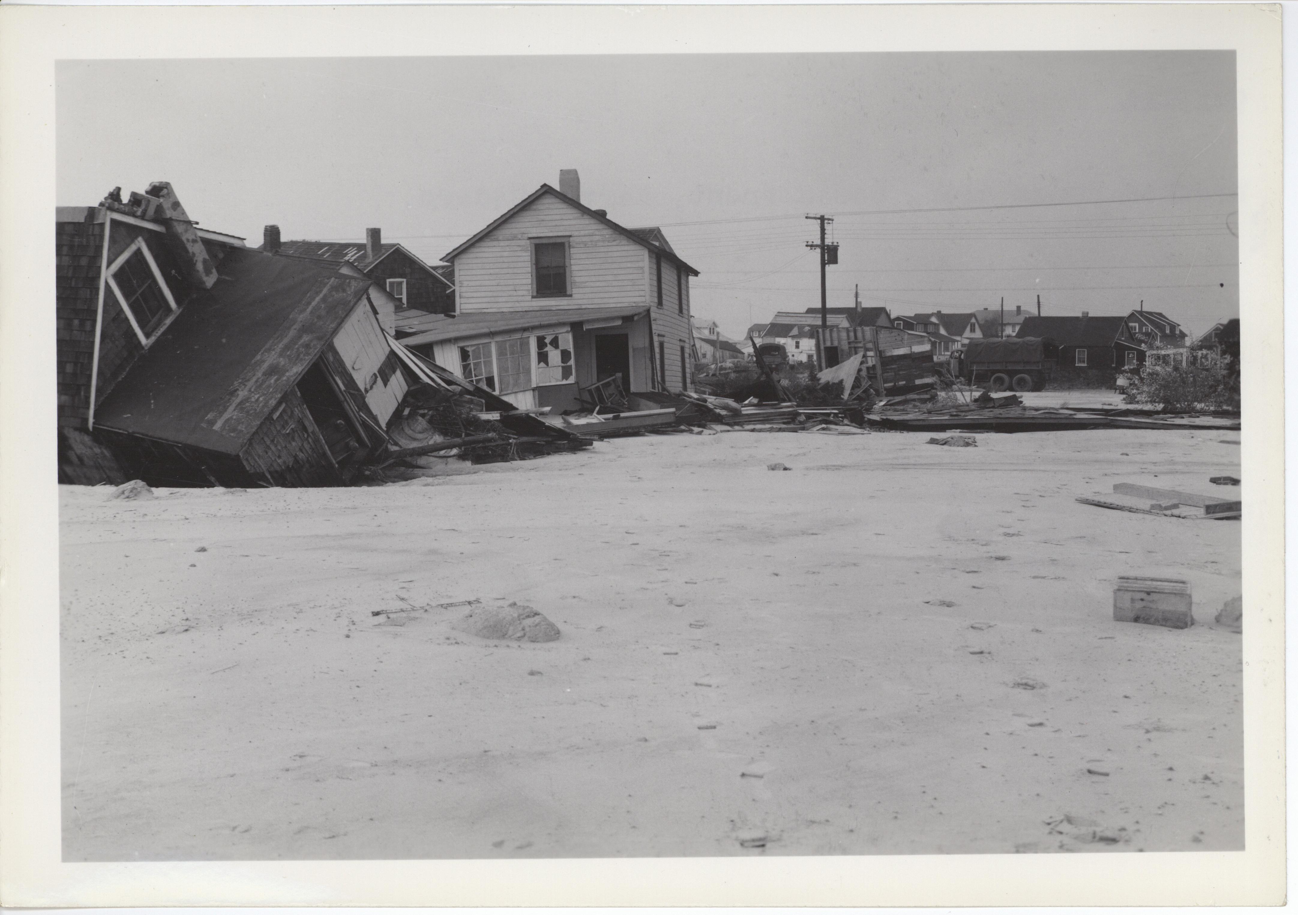 Reverse of Photo: Wrecked homes along ocean front