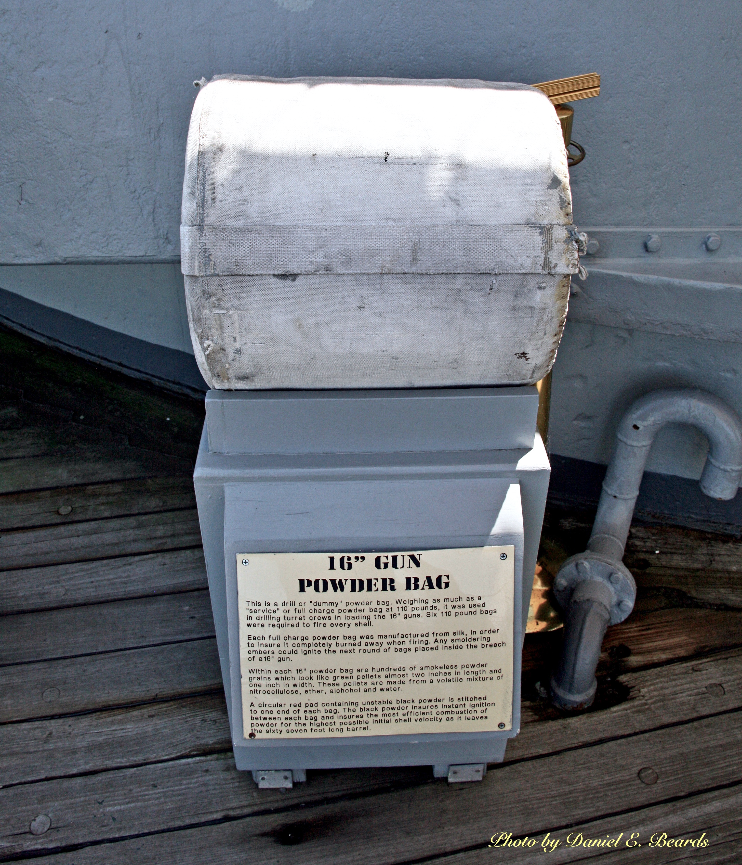 The 16" guns are termed 'bag guns', meaning that the propellant charge is contained in bags which are loaded separately from the projectiles. The guns require a large amount of powder for the projectile to attain its required initial velocity. If the powder was placed in a single container, the size and weight would make loading difficult and slow and would greatly complicate the powder-handling machinery. By breaking up the charge into sections and packing the powder grains in fabric bags, the sections were easily handled by the turret crew.