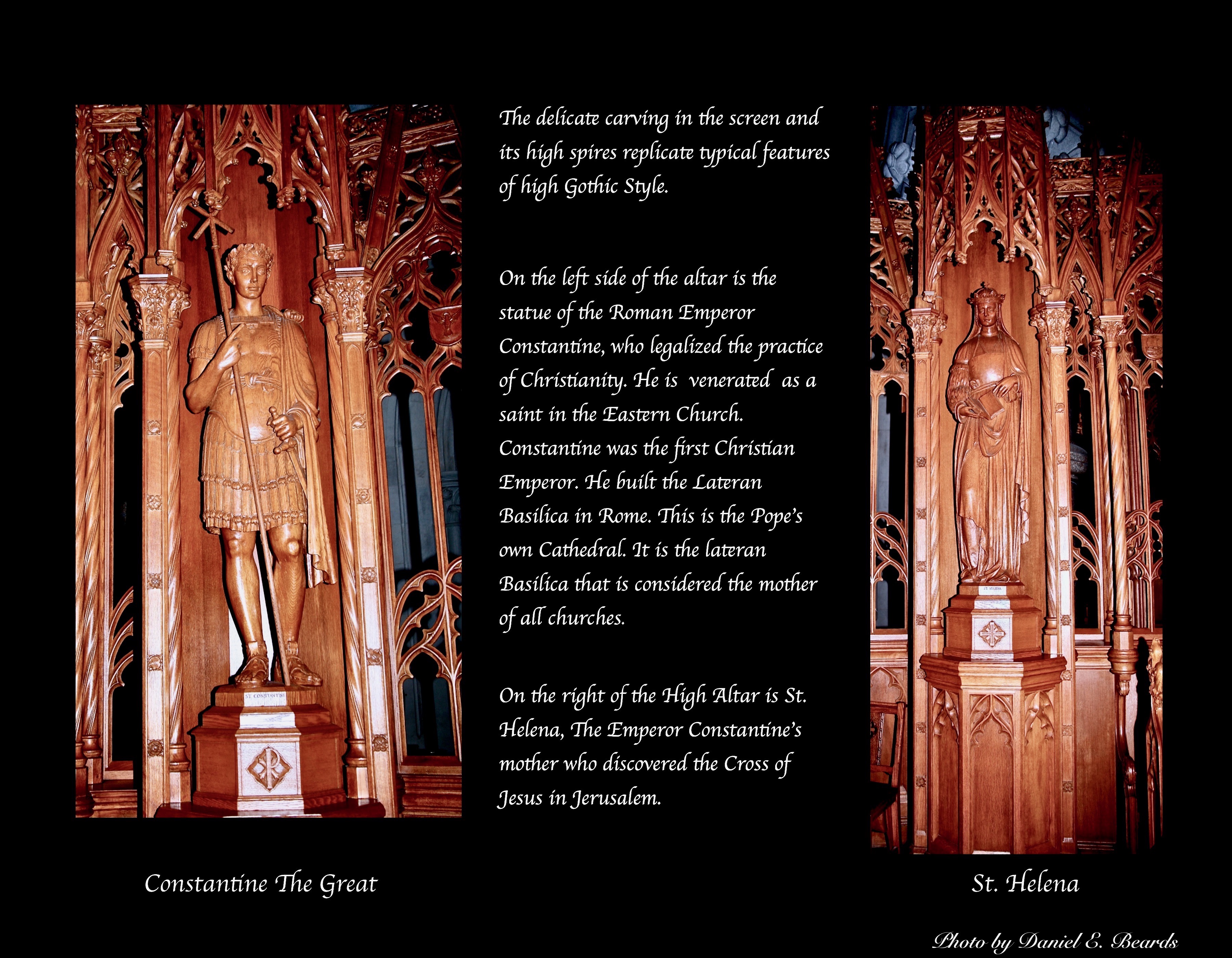 This screen separates the Ambulatory from the Sanctuary. Carved into this screen are figures of the Archangels Michael and Raphael as well as St. Vincent the Deacon. The screen is also decorated with medallions depicting the 25 virtues, 17 symbols of Our Lord and 8 emblems of the church.