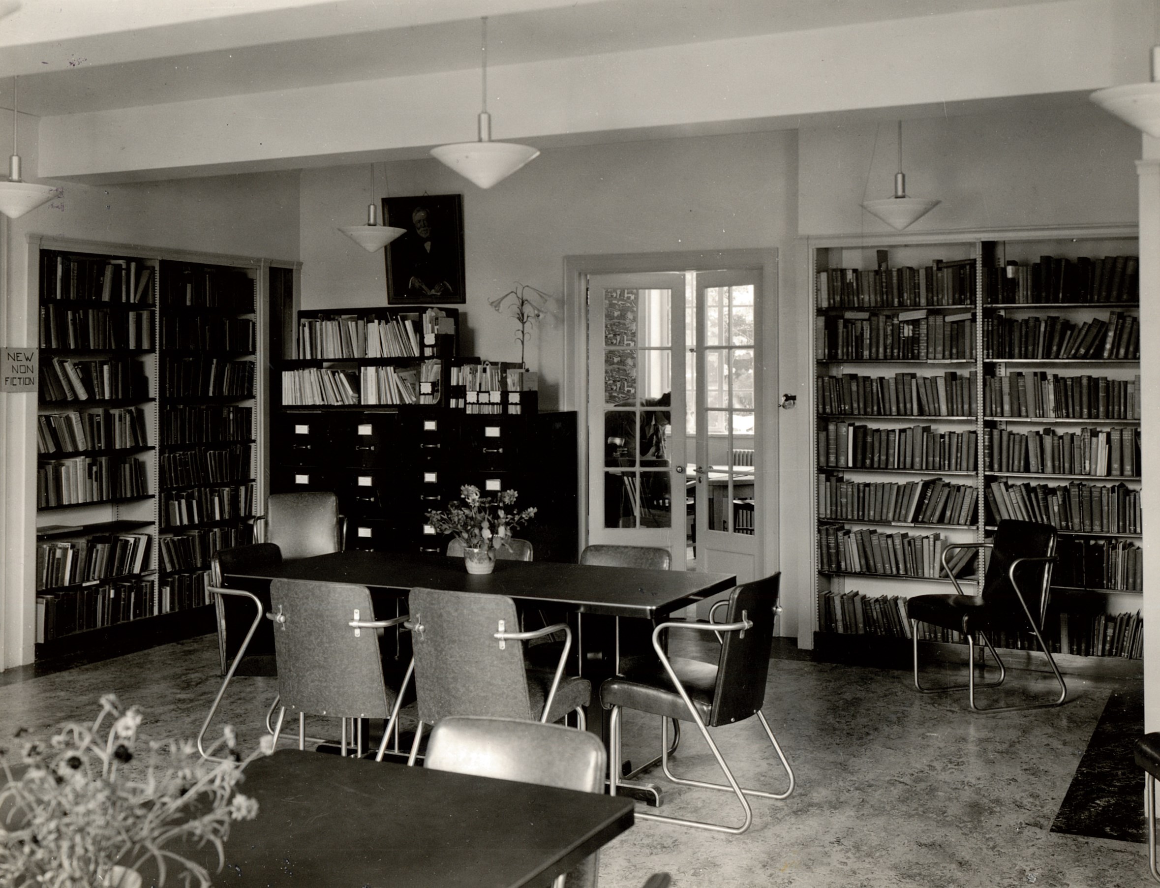 Back of photo: "Non-fiction study room, office in rear." Date unknown.