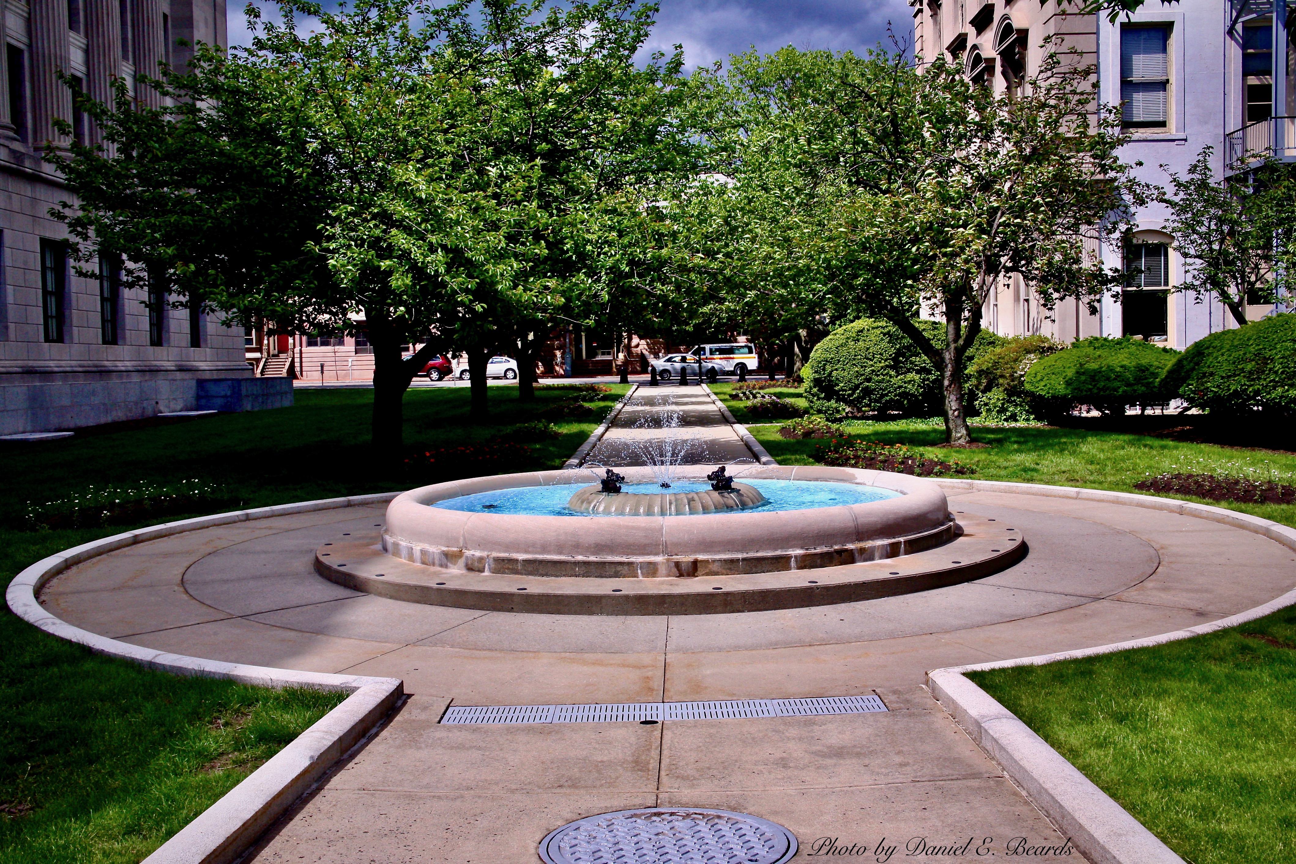 This fountain lies in a narrow strip of land between the State Capitol building and the State House Annex. There is a path that originates from the sidewalk along West State Street and extends far back to the extension of land part of the Capitol Park. There are metallic frogs which spew water to the outside perimeter of the concrete fountain.