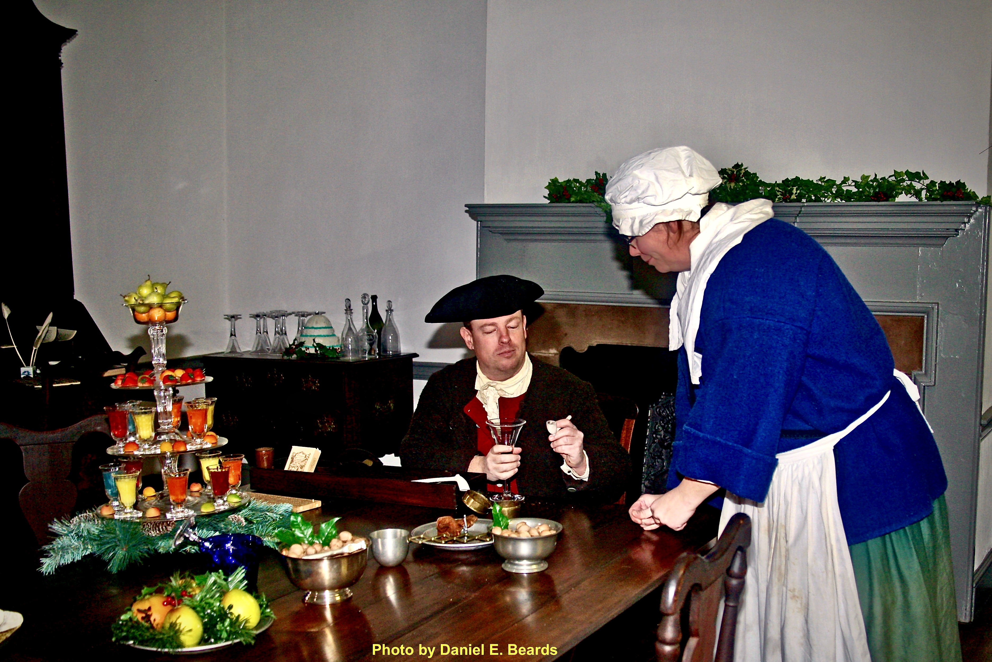 Here a senior member of Washington's staff enjoys a meal at the Ford mansion over the Christmas Holidays,