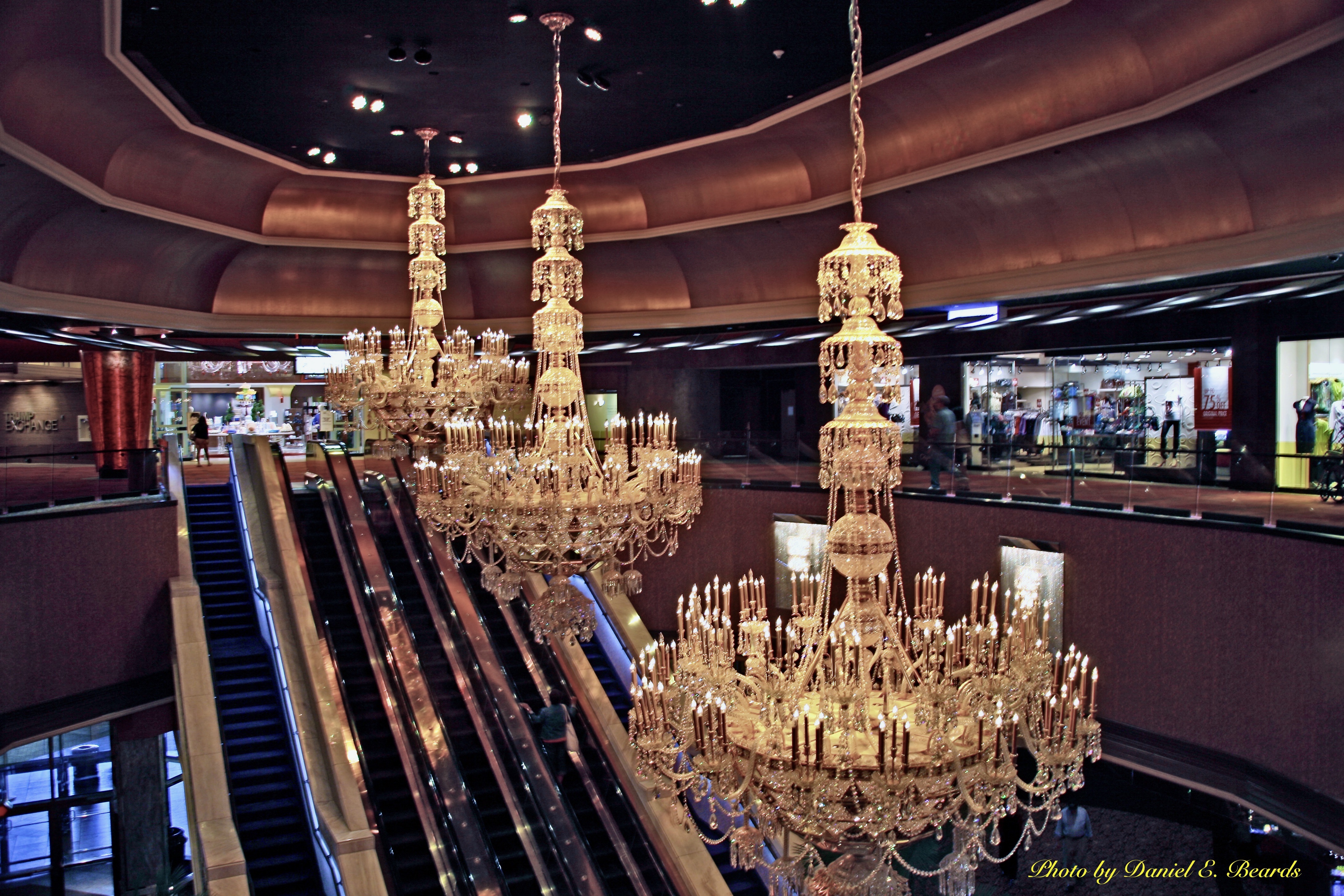 The three largest chandeliers above the main escalators cost $250,000 apiece. It is estimated that Mr. Trump spent over $14 Million dollars on crystal chandeliers for the building.