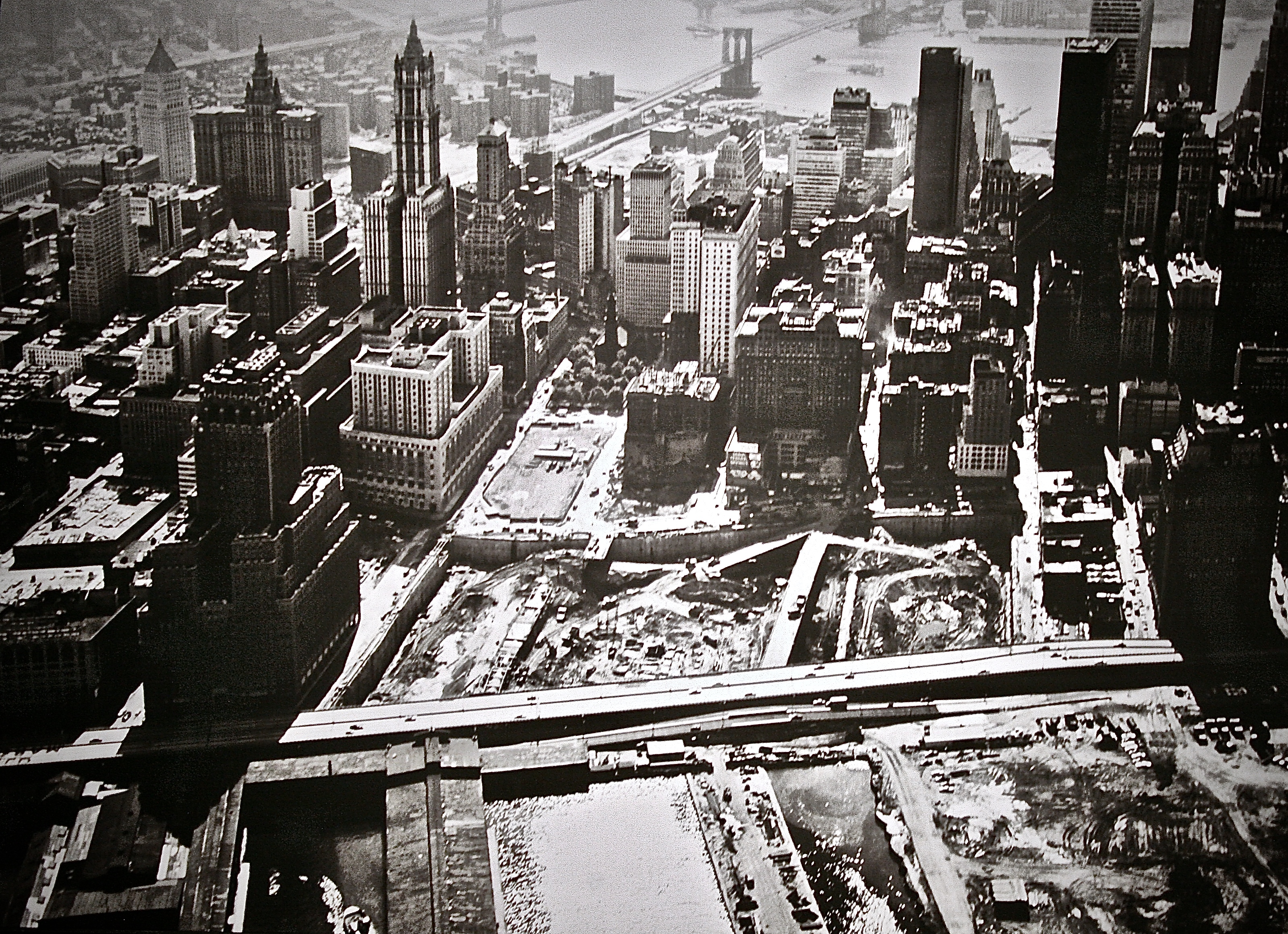 This was the site selected by the Port Authority for the construction of The World Trade Center. This picture was taken prior to the construction of the project. At that time the area was known as Radio Row. It was a warehouse district on the lower West Side of Manhattan. It consisted of several blocks of electronic stores. The used radios, war surplus electronics, junk and parts were often piled so high they would spill out into the street, attracting collectors and scroungers. It was considered as the origin of the electronic component distribution business.