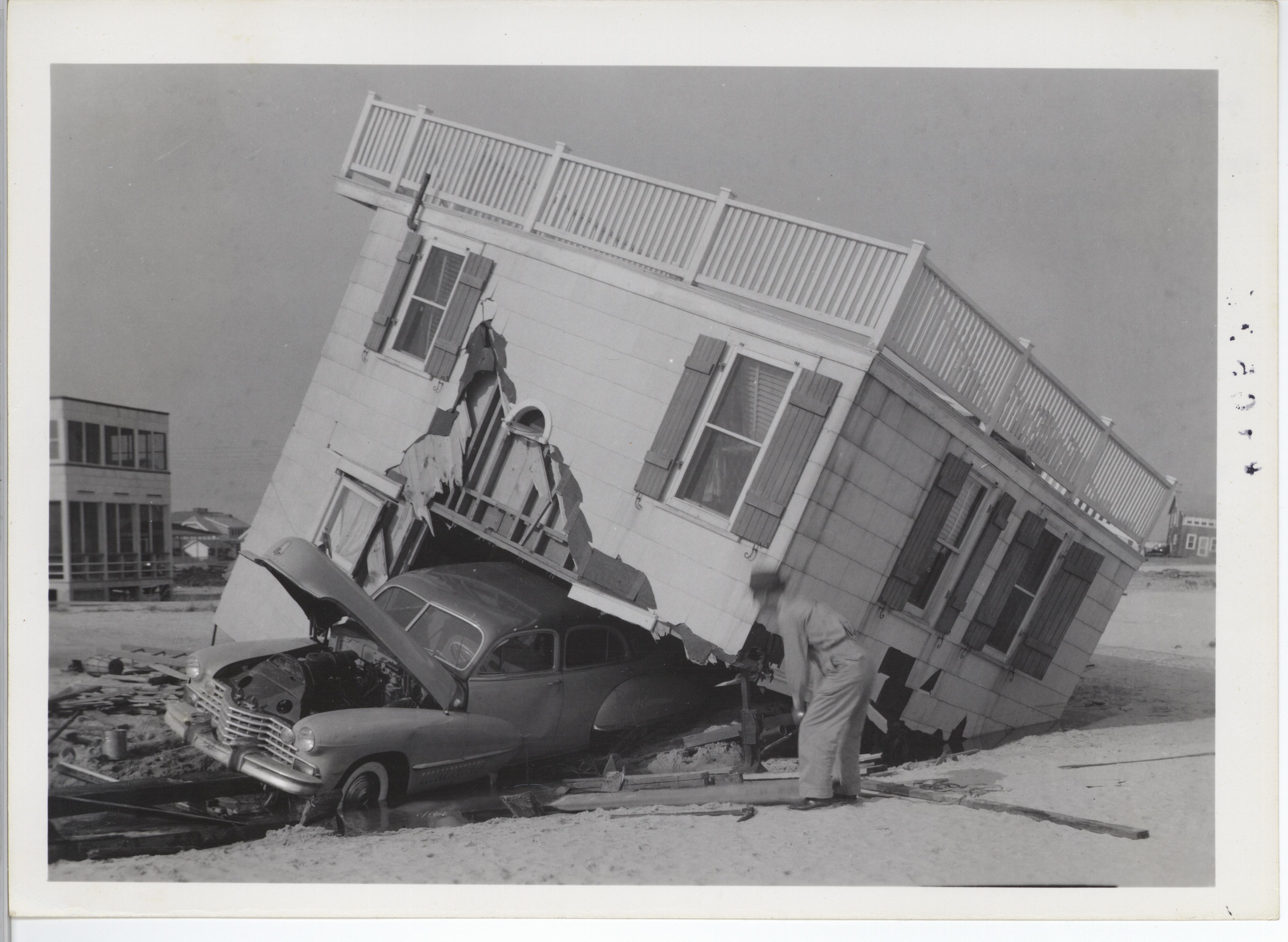 Reverse of Photo: Wrecked house with two cars underneath. Location: 2nd & 3rd Aves.