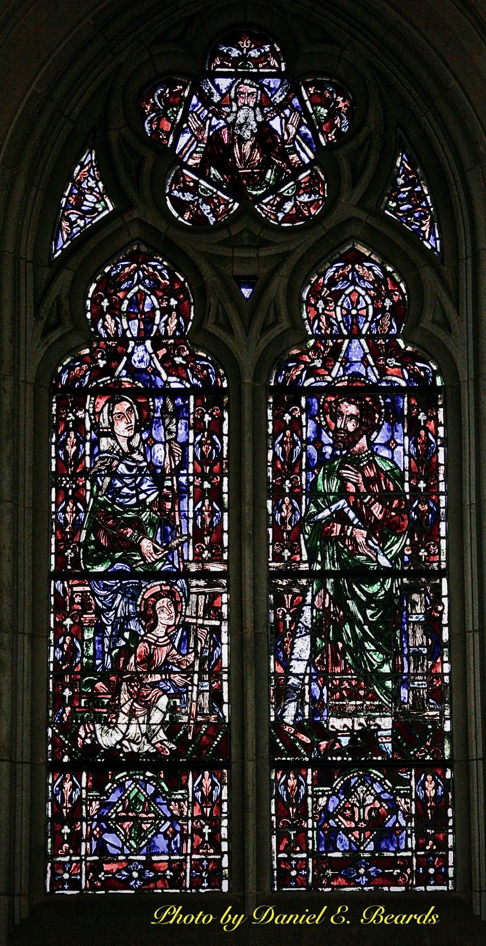 This window in St. Joseph's Chapel depicts the Holy family. Joseph, Mary and Jesus. If you look carefully you with also notice God The Father looking down on them.