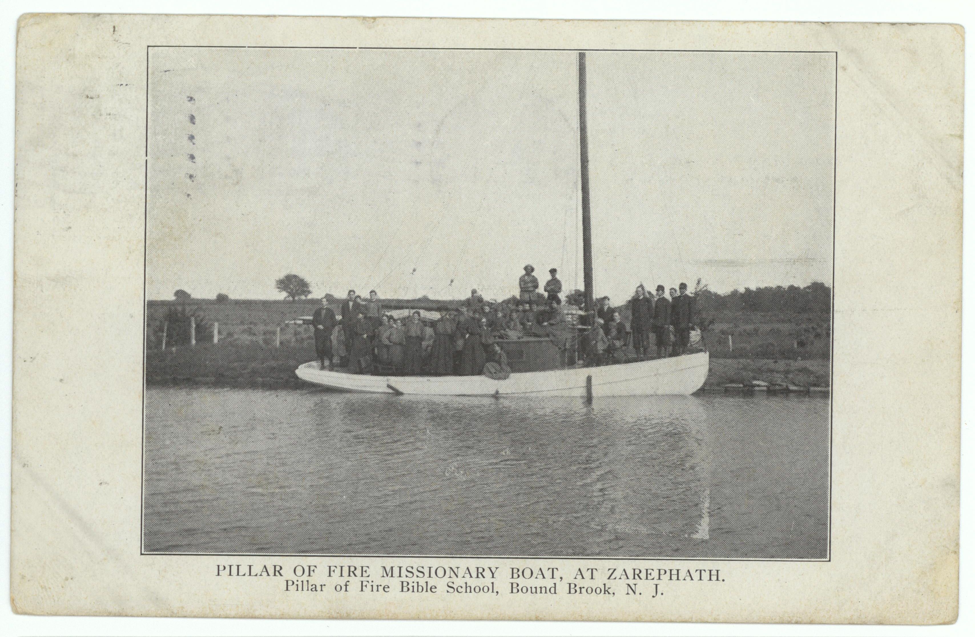 Pillar of Fire Missionary Boat, at Zarephath. Pillar of Fire Bible School, Bound Brook, N.J.