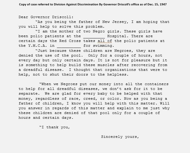Copy of Case Referred to Division Against Discrimination by Governor Driscoll's Office as of Dec. 15, 1947