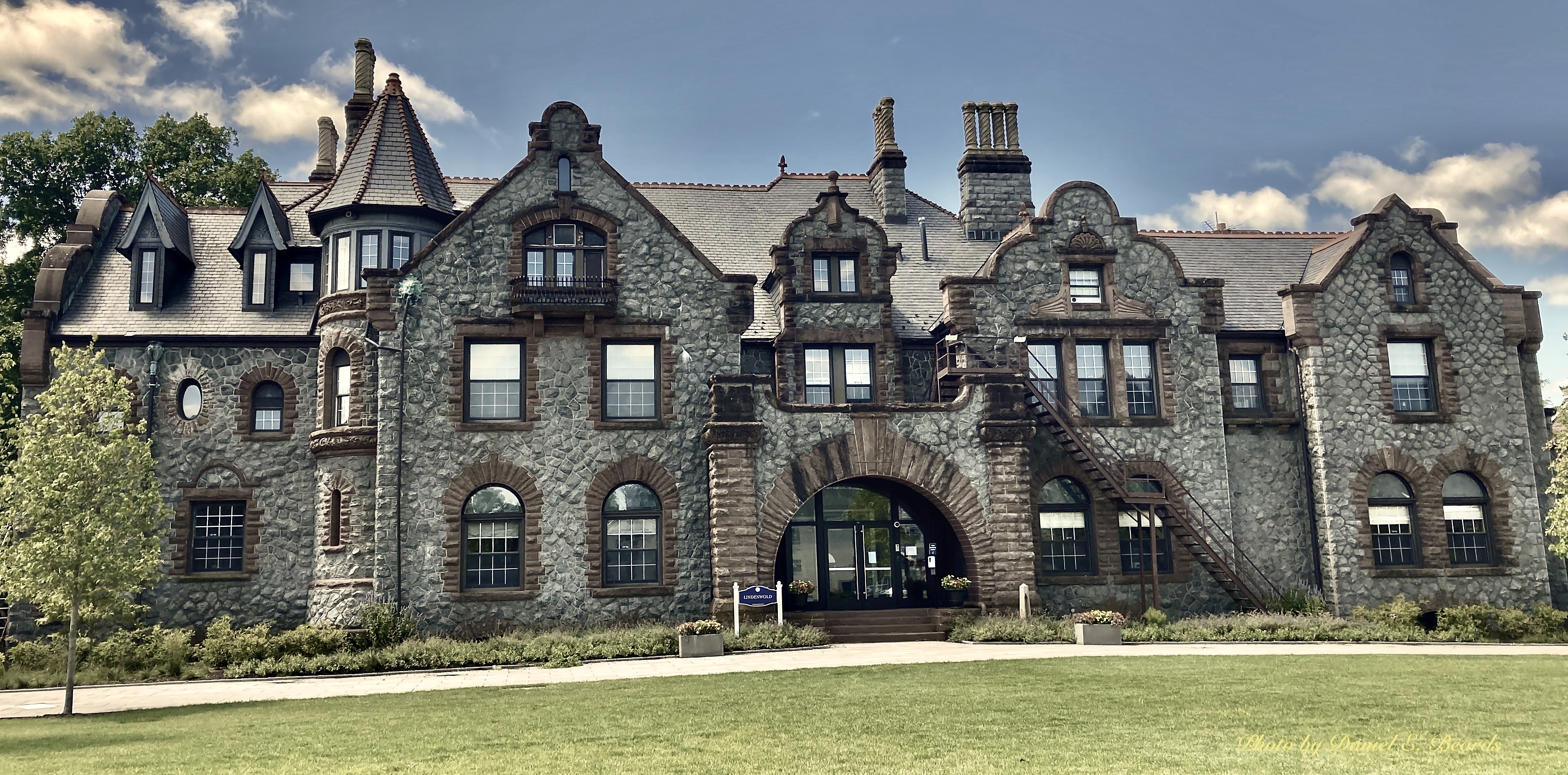 Lindenwold is a two and one-half story stone building featuring Victorian Gothic architecture with Jacobean Revival and Queen Anne motifs.