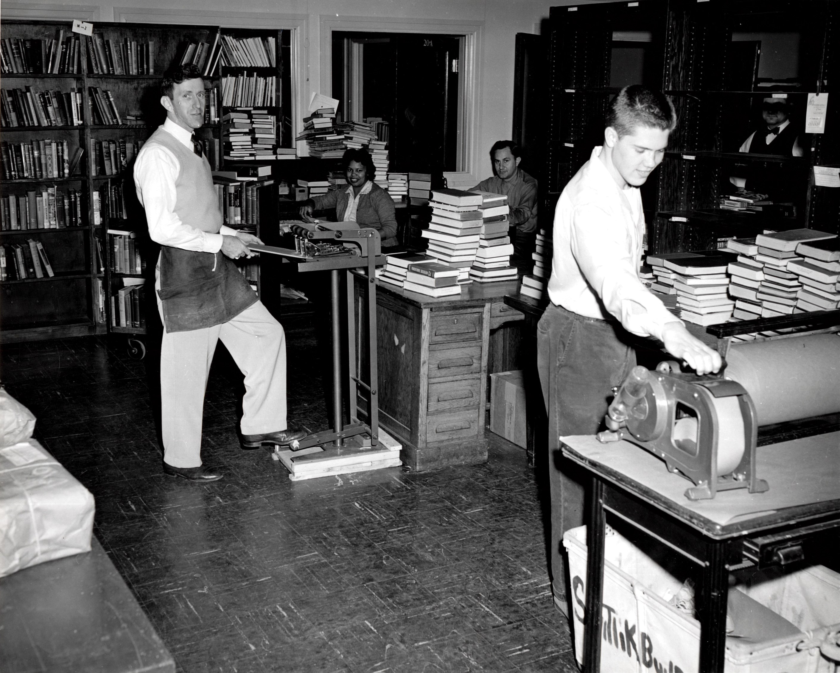 The New Jersey State Library rented space in the Switlik building during the 1950's. Back of Photo: "Shipping Room - Switlik Building. Leon Prynoski, Jerry Bleistein, Arthur Covell, Mary Hightower, Lester Foster." Date unknown.