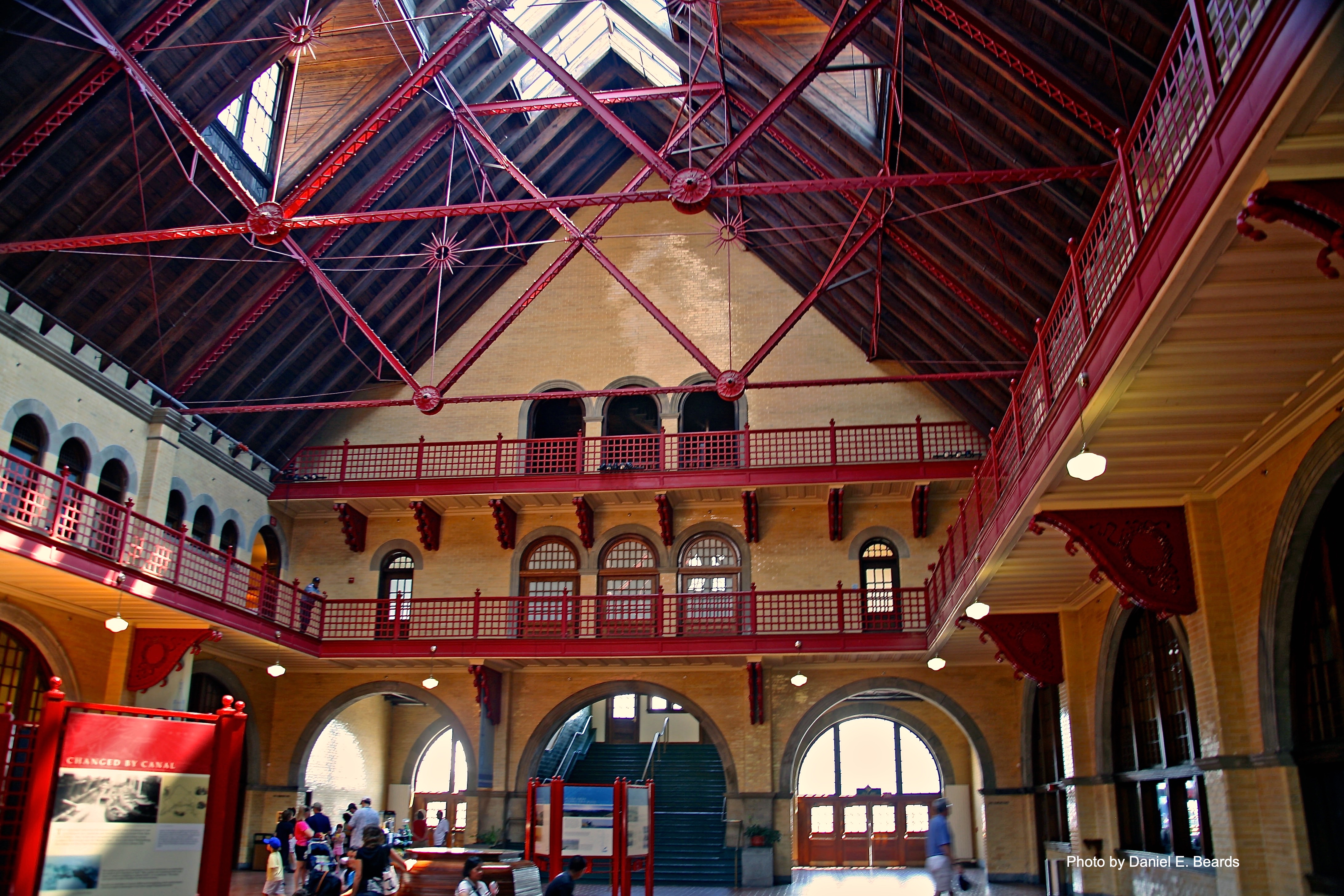 The main building is designed in a Richardsonian Romanesque style. The intermodal facility contains more than a dozen platforms and several ferry slips. Arriving passengers would walk to the railhead concourse and could either pass through its main waiting room, by-pass it on either side, and take stairs to the upper level