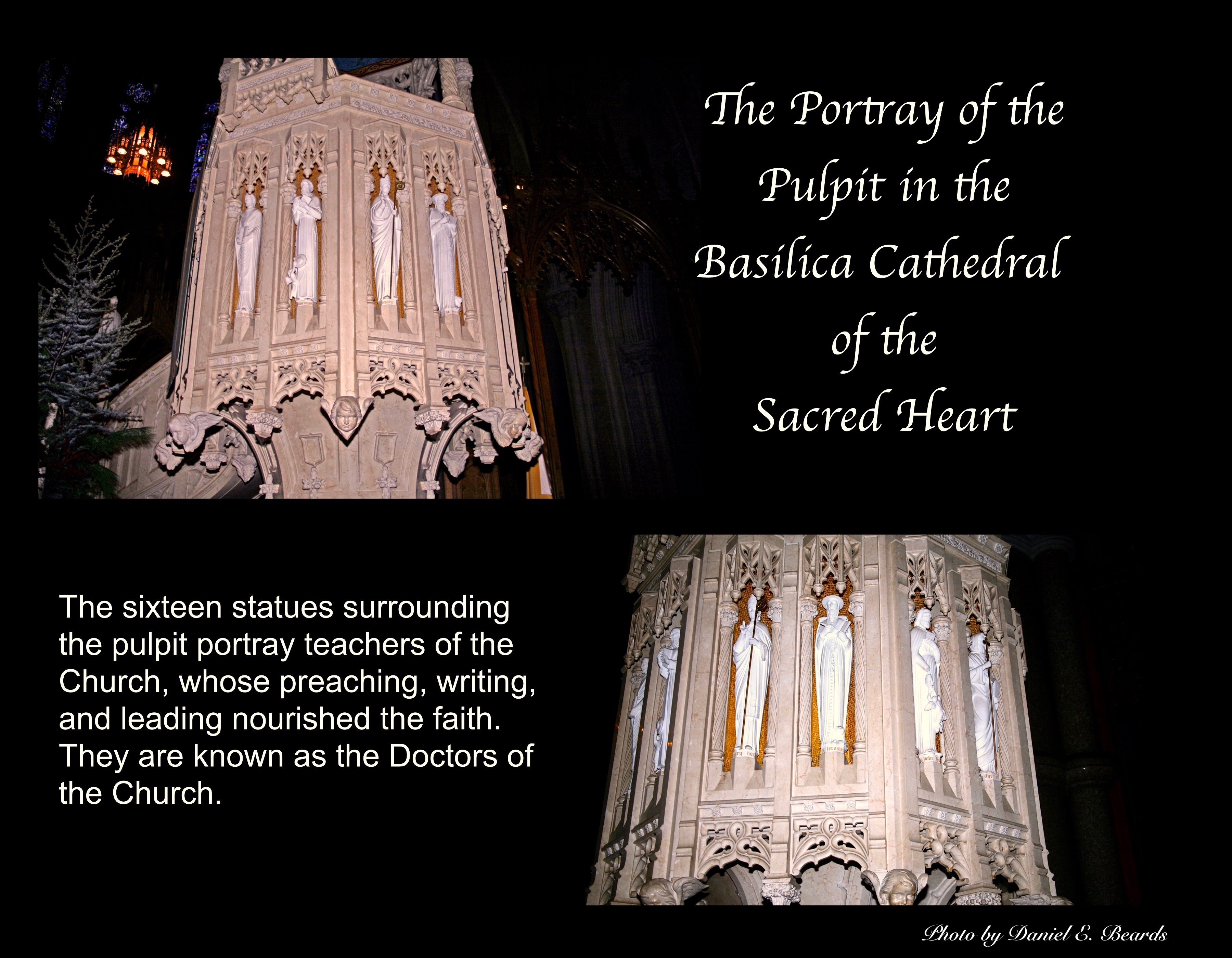 The sixteen statues surrounding the pulpit portray doctors (teachers) of the Church, whose preaching, writing, and teaching nourish faith.