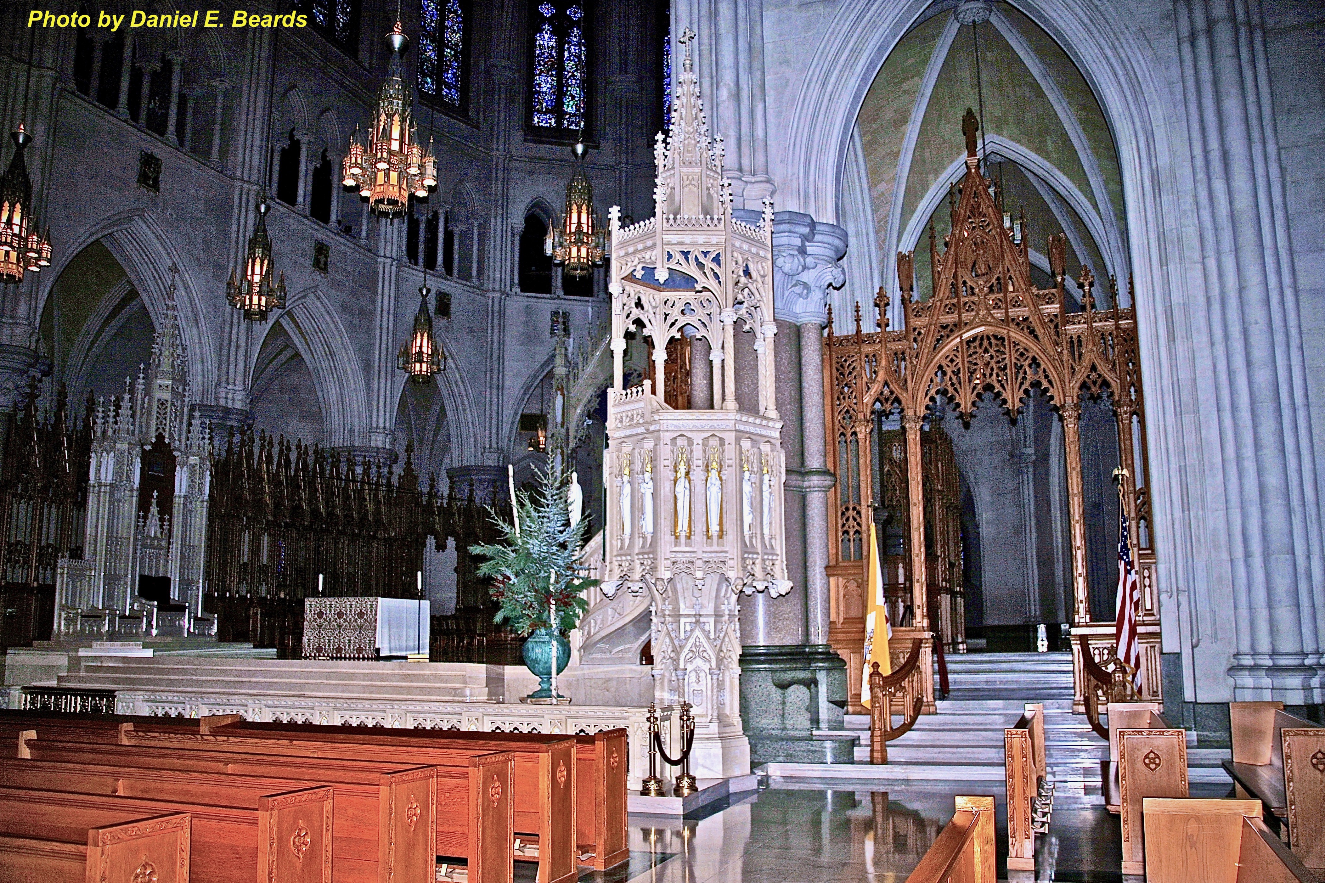 The pulpit is Sacred Heart is to the right of the communion rail, at the east corner of the sanctuary.