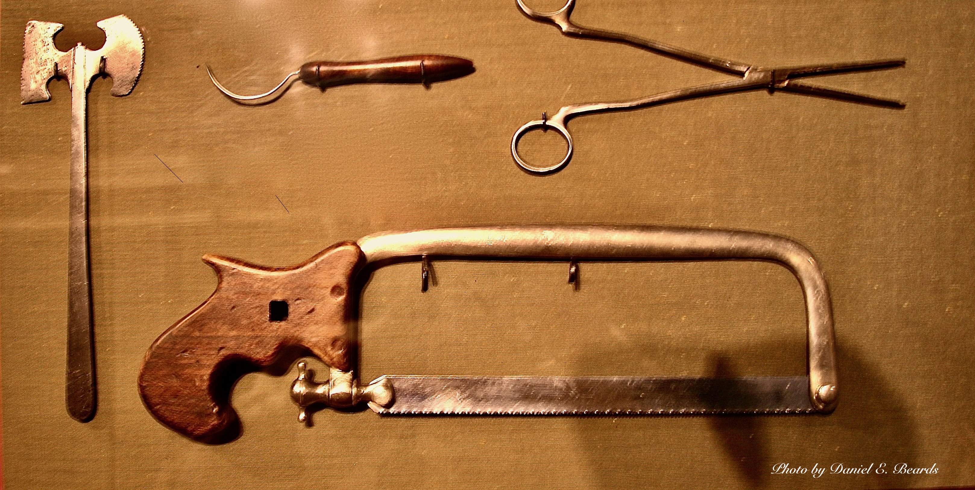 Surgery to remove bullets was unbearably painful without anesthesia. In addition, the absence of antibiotics to treat infected wounds and the inability to repair shattered bones often made amputation necessary. Shown in this picture is a small surgical saw, a tenaculum which was used to pull an artery from a stump so that it could be tied to prevent further bleeding and forceps.