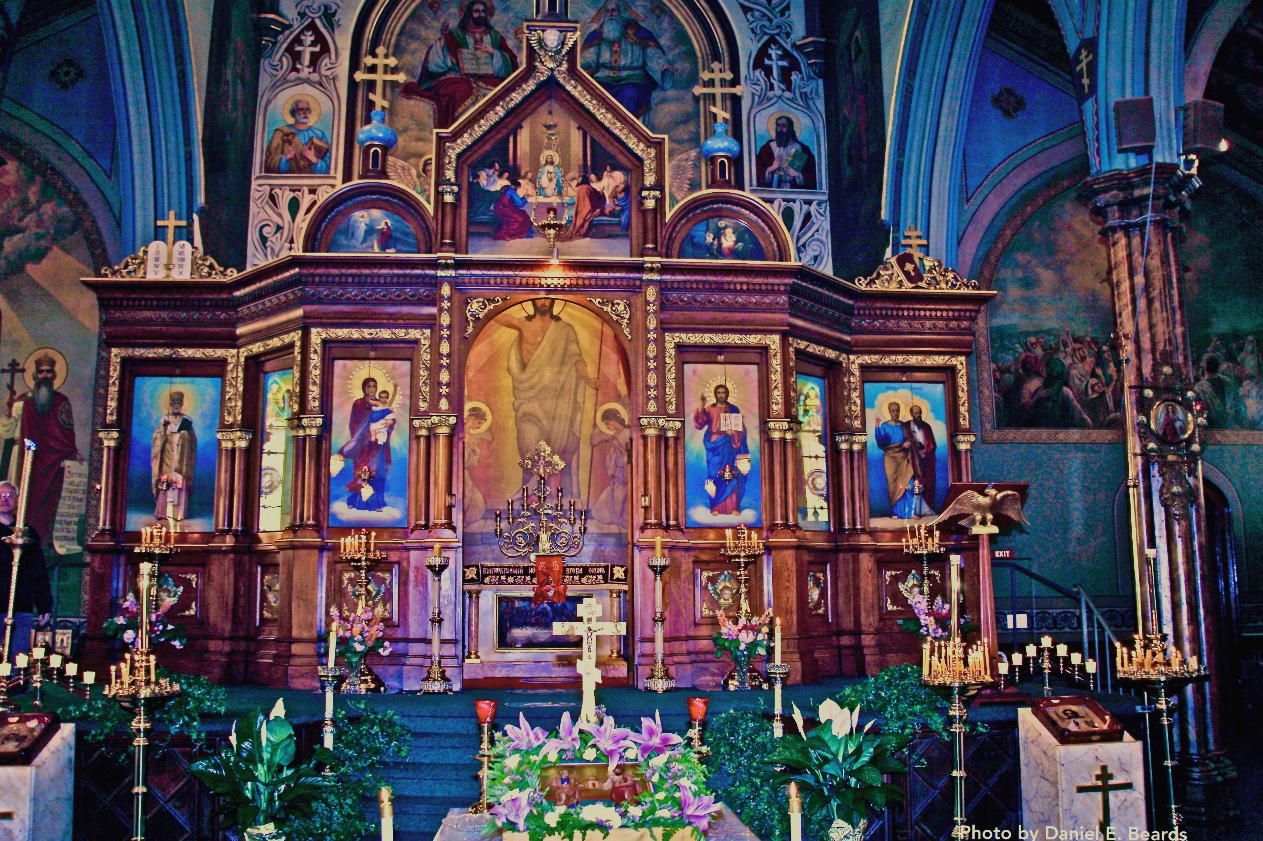| dc.description | With the Royal Doors open this photo shows the Altar Table and the Icon of The Risen Christ in Saints Peter and Paul Cathedral in Jersey City. On either side of the Royal Doors are two Icons. On the left side of the royal door is the icon of the Incarnation (mother with child). On the right side of the doors is the icon of the second coming of Christ the Pantocrator (Christ in majesty) | |