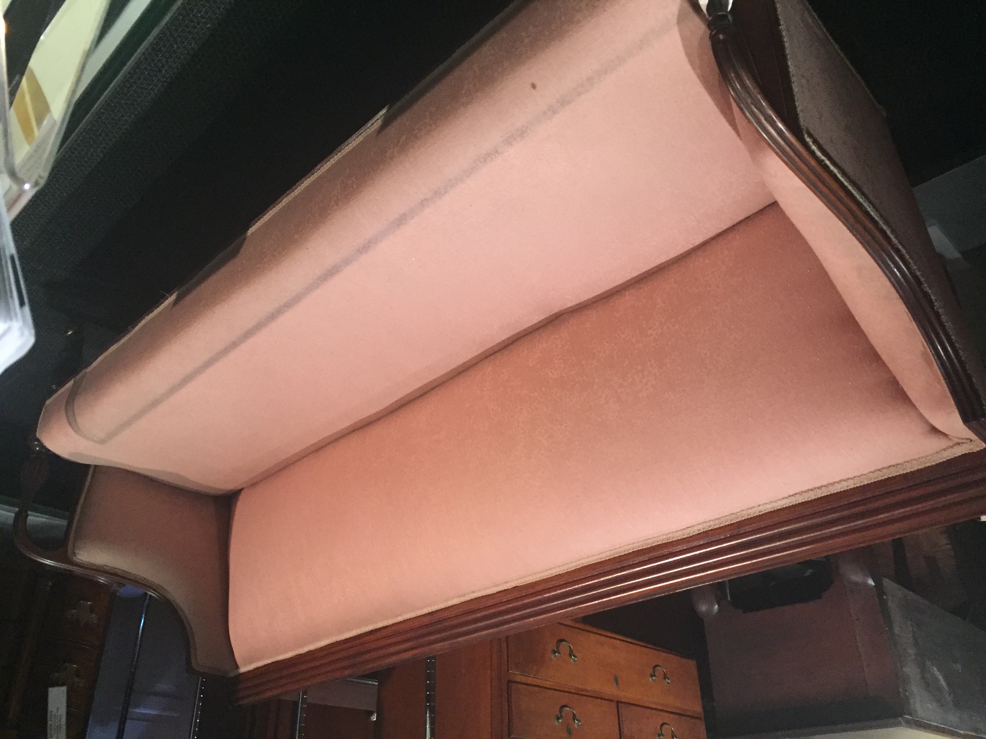 This couch was owned by Alexander Hamilton. It is on display at the Morristown National Historical Park Museum. It is covered in Rose fabric with mahogany legs.