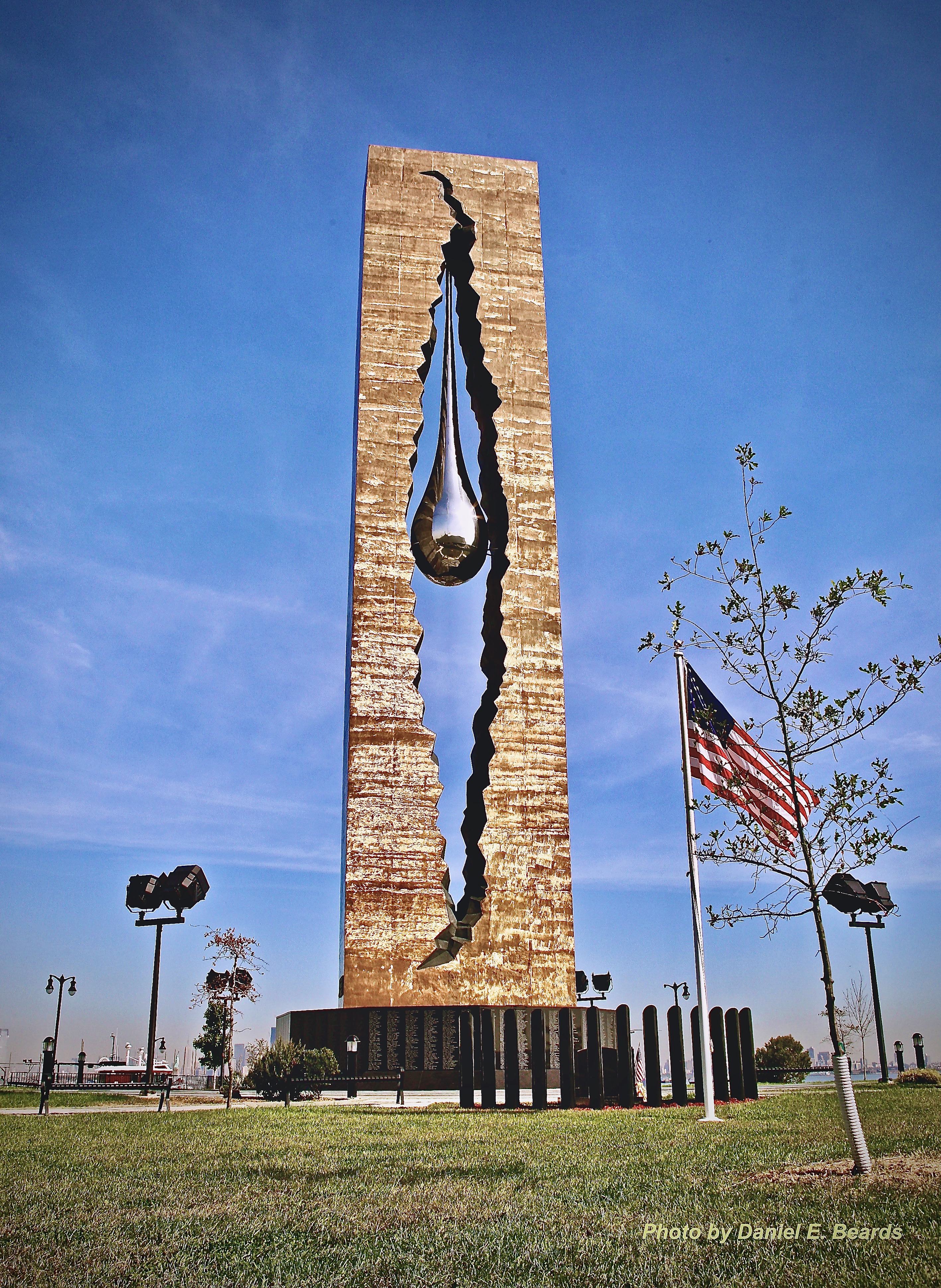 | dc.description | To the Struggle Against World Terrorism 9-11 teardrop 1.jpeg The sculpture comprises a 100-foot bronze-clad tower split with a jagged opening in the middle, in which hangs a 40-foot tall nickel-surfaced teardrop. The eleven sides of the monument's base bear granite name plates, on which are etched the names of those who died in the September 11 attacks and the 1993 World Trade Center bombing. However, like some other 9/11 memorials, the dedication was based on an outdated compilation and contains about forty people who were removed from later victim listings | |