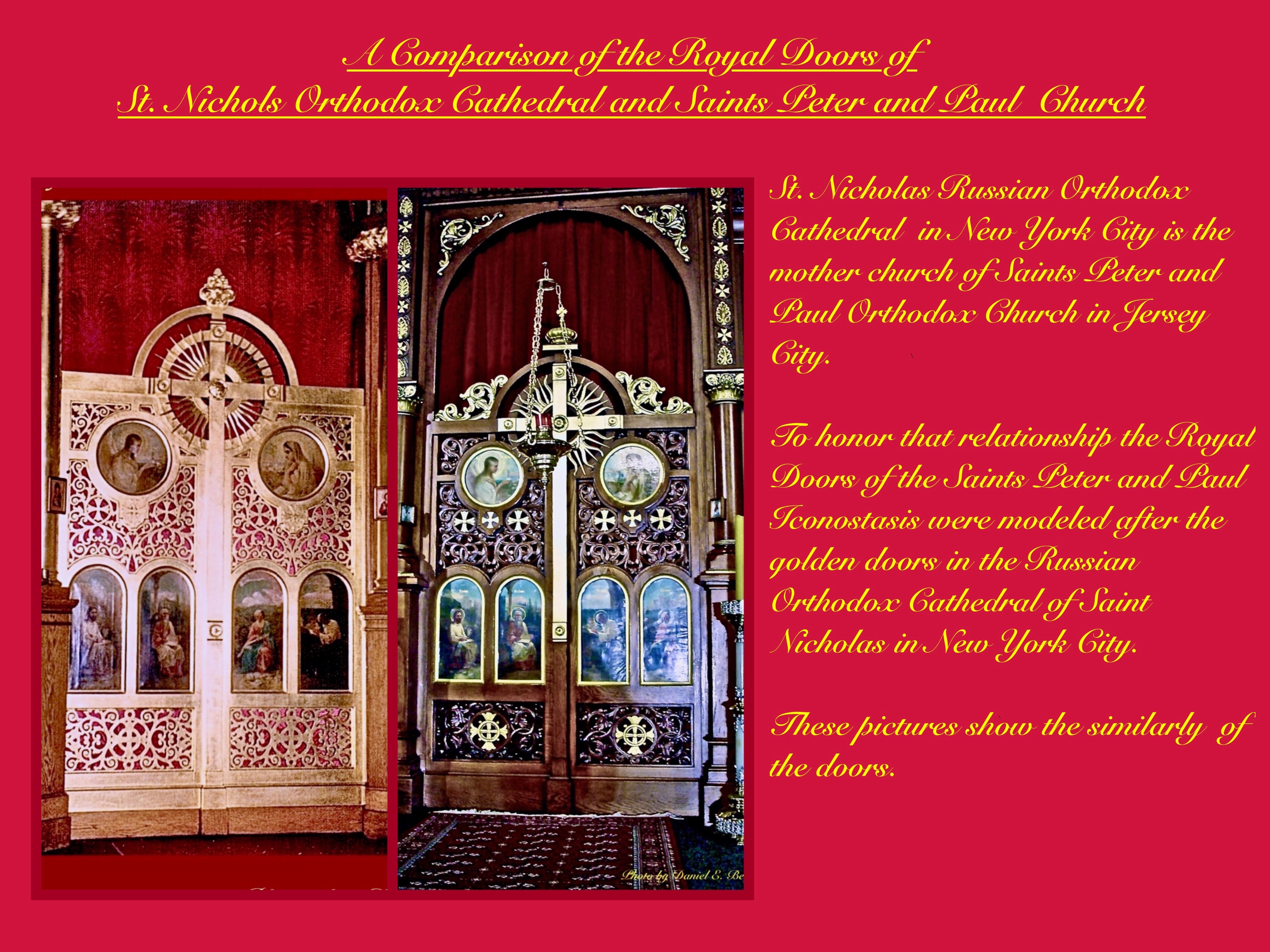 These are the Gold Royal Doors of St. Nicholas Russian Orthodox Cathedral in New York City and the Royal Doors of Saints Peter and Paul Orthodox in Jersey City.