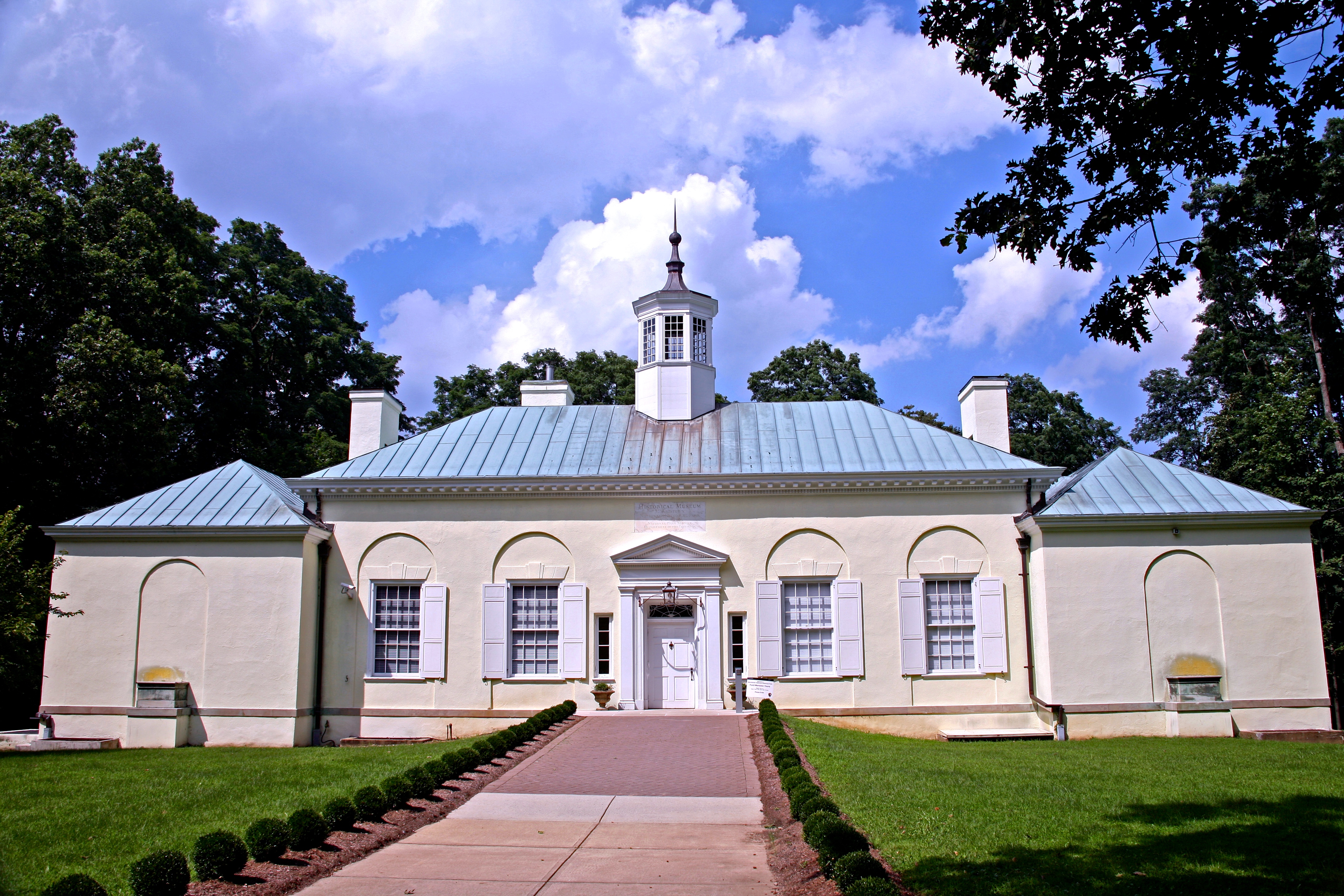 The 1930's Washington's Headquarters Museum is open daily from 9:00 a.m. to 5:00 p.m. The museum features three exhibit galleries and an introductory video. It is the view looking north from the rear of the Ford Mansion that reveals the intent and inspiration of the Museum�s architect, John Russell Pope. From this perspective, the building strongly evokes of the sweep and grandeur of George Washington�s own Mount Vernon. Pope, the architect of the Jefferson Memorial in Washington, DC, designed a structure that would secure the substantial collection of the Washington Association and other acquisitions, today numbering more than a half-million pieces. Inside, original documents, textiles, paintings, period weapons, prints, china, maps, and other artifacts�less than 1% of which have ever been seen by the public�are housed in its vaults. And outside, the stately character of Washington�s own hand in the architecture of Mount Vernon is echoed.