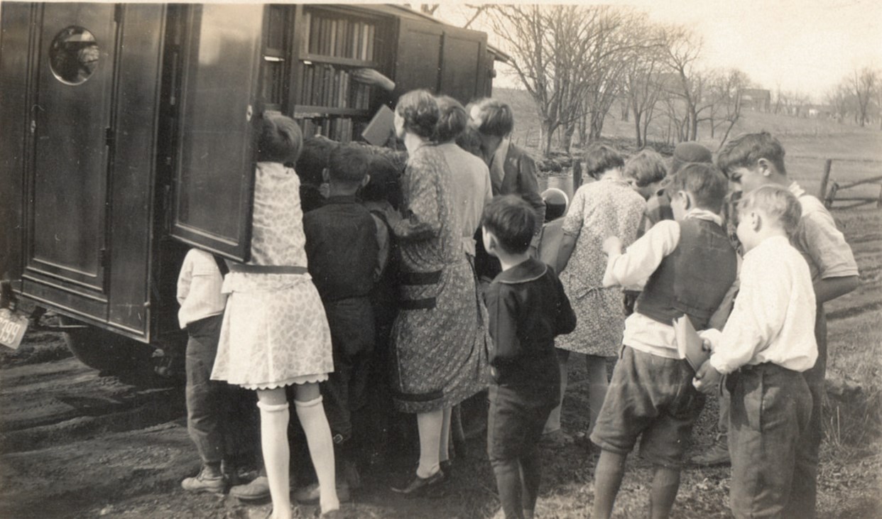 Back of Photo: "Book truck calls at a county school." Date unknown.