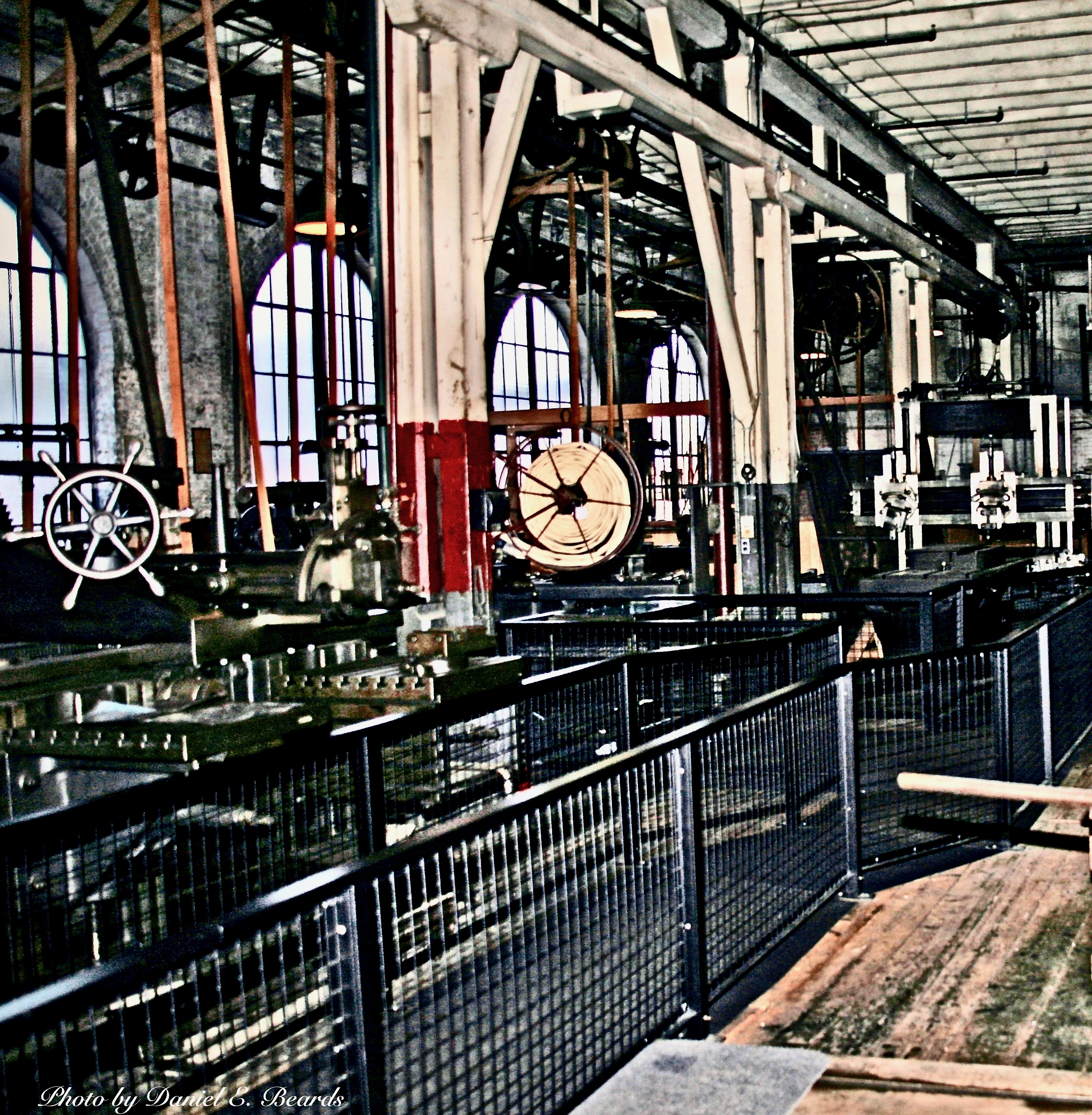 View of the heavy machine shop on first floor of the building. Note the long drive shafts running along the ceiling. These were powered by two huge electric motors at one end of the shop and all the belts hanging down powered the individual machines on both first and second floor.