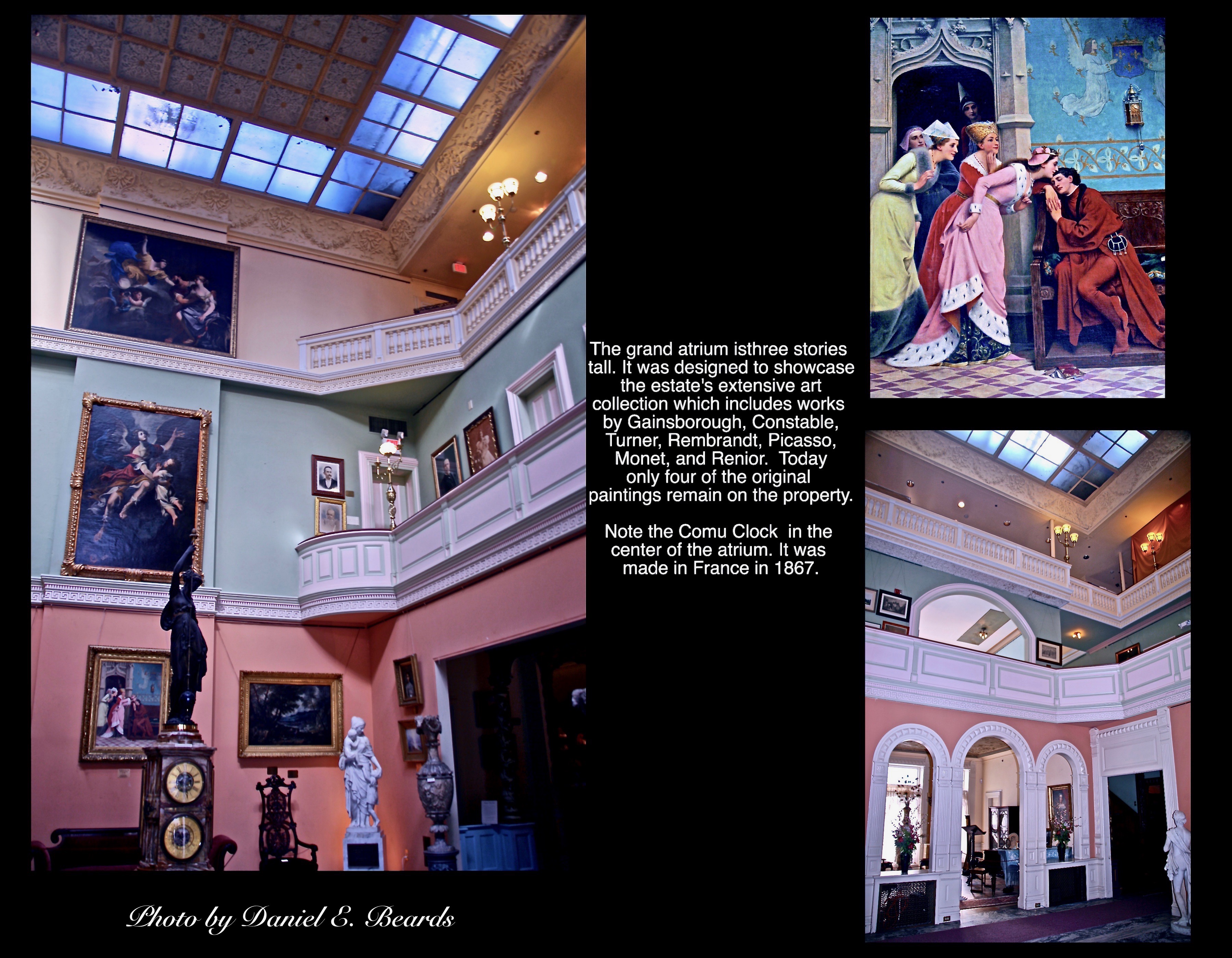The interior of the Castle was organized around a three-story open atrium called the court. It was here that Lambert displayed many of his prized European and American paintings. His collection included works by Rembrandt, Renoir, Courbet, Monet, and Balkelock. The interior of the Castle reflected the eclectic styles of the Gilded Age. In the center of the atrium is the Cornu Clock made in France circa 1867. It stands almost eleven feet tall and weighs over 3,000 pounds. The clock is number 18 in a series of 36 and is thought to be the largest and most elaborate of the series