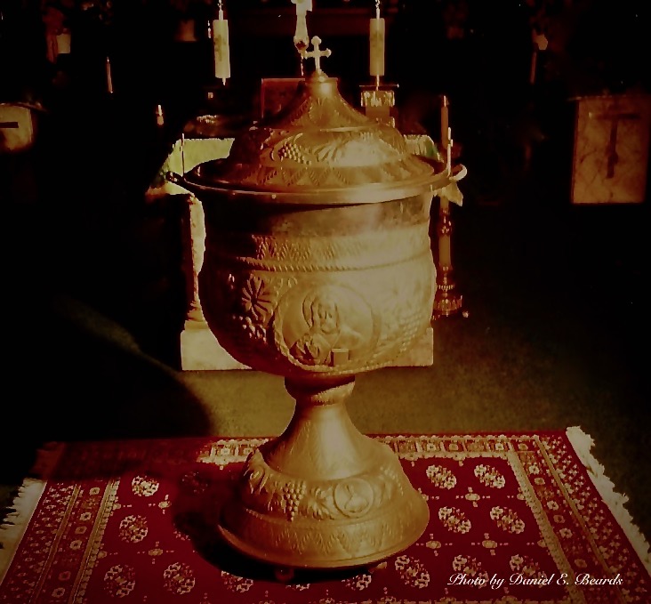 The baptismal font is a basin or other receptacle that can hold water and is central to the Orthodox Sacrament of Baptism. The font font is generally made of metal - aluminum, brass, copper - with a pedestal at the bottom. The overall shape is of a chalice � similar to the shape of the chalice used in Communion. The basin above the pedestal holds the holy water.