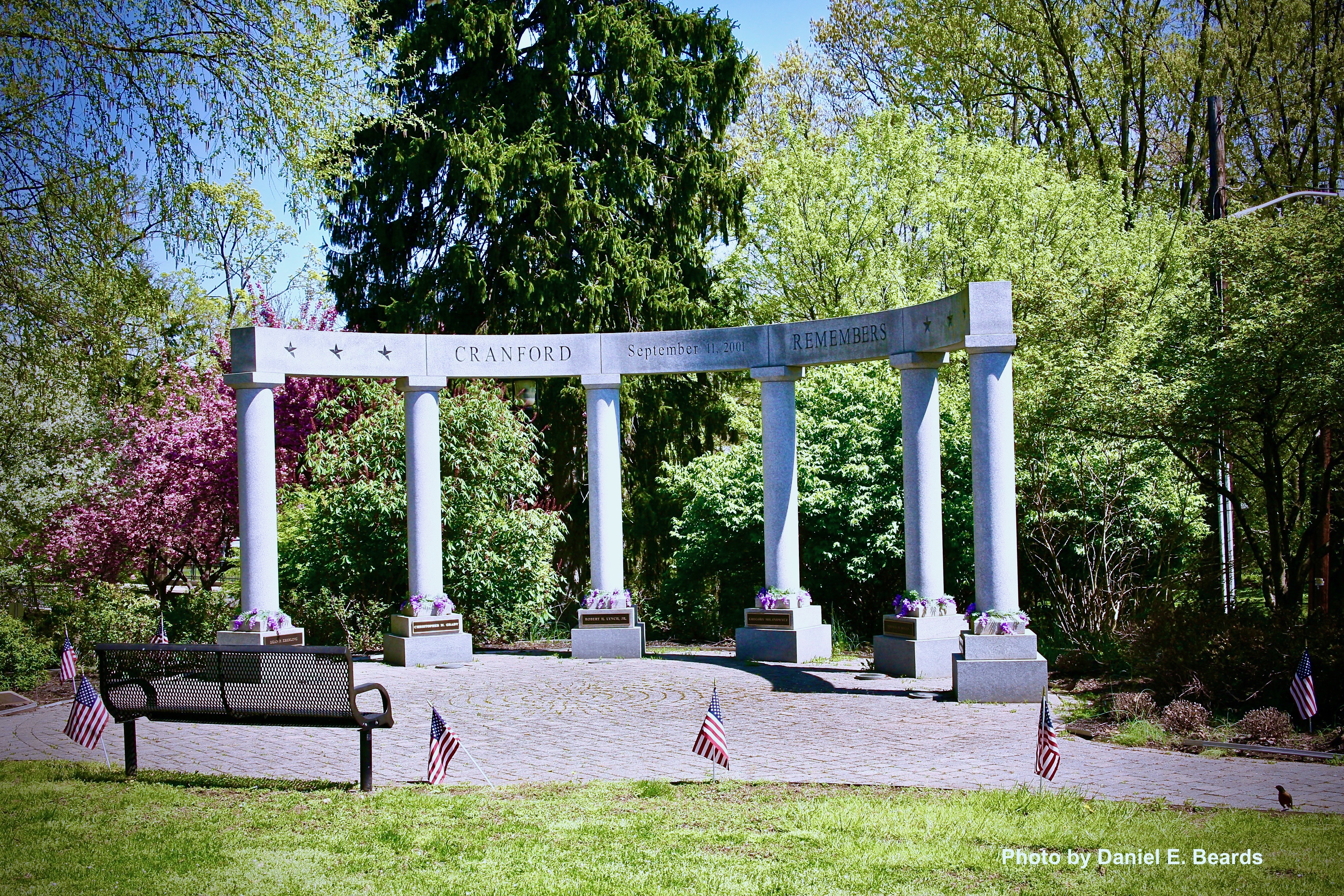 Each column bears a commemorative plaque with the name of a Cranford resident who was lost in the attacks.