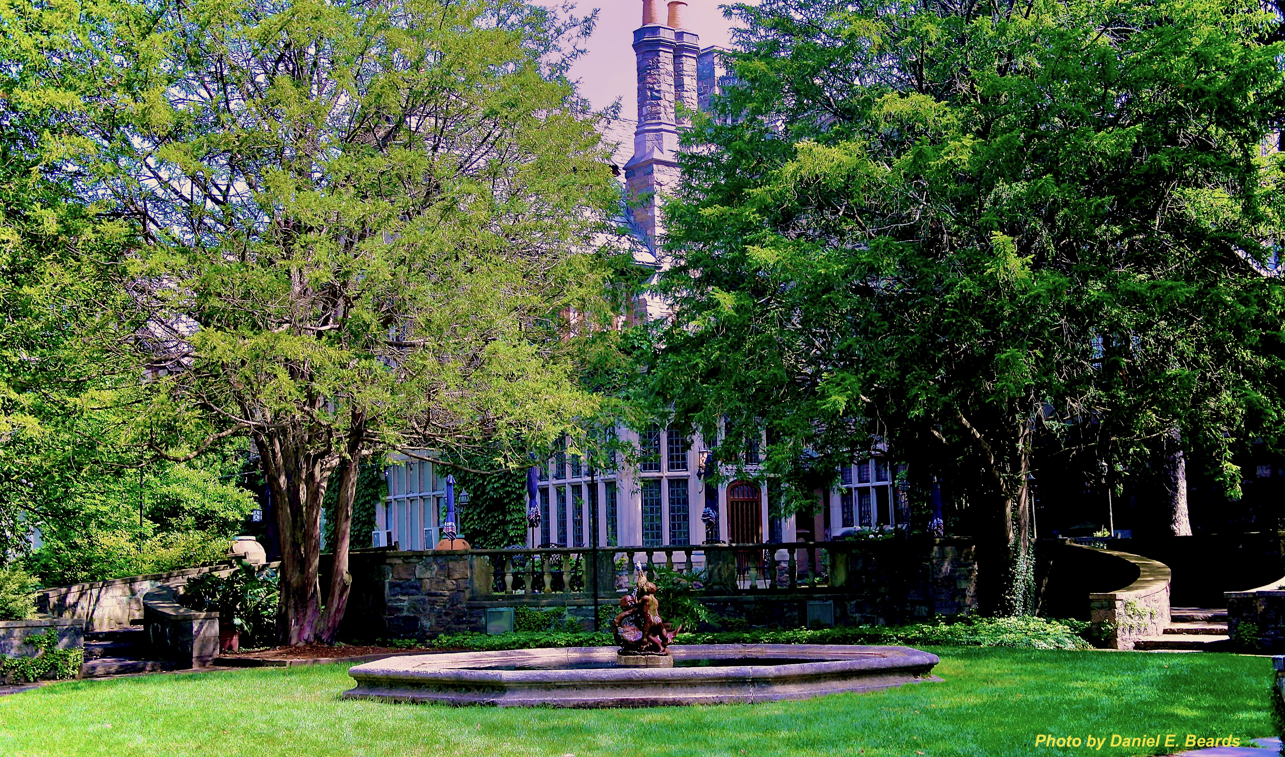In the center of the garden is this swan fountain. It was placed in this garden to provide the relaxing sound of cascading water near the Manor House. In the center of the fountain is a unique old English statue depicting two cherubs holding a swan
