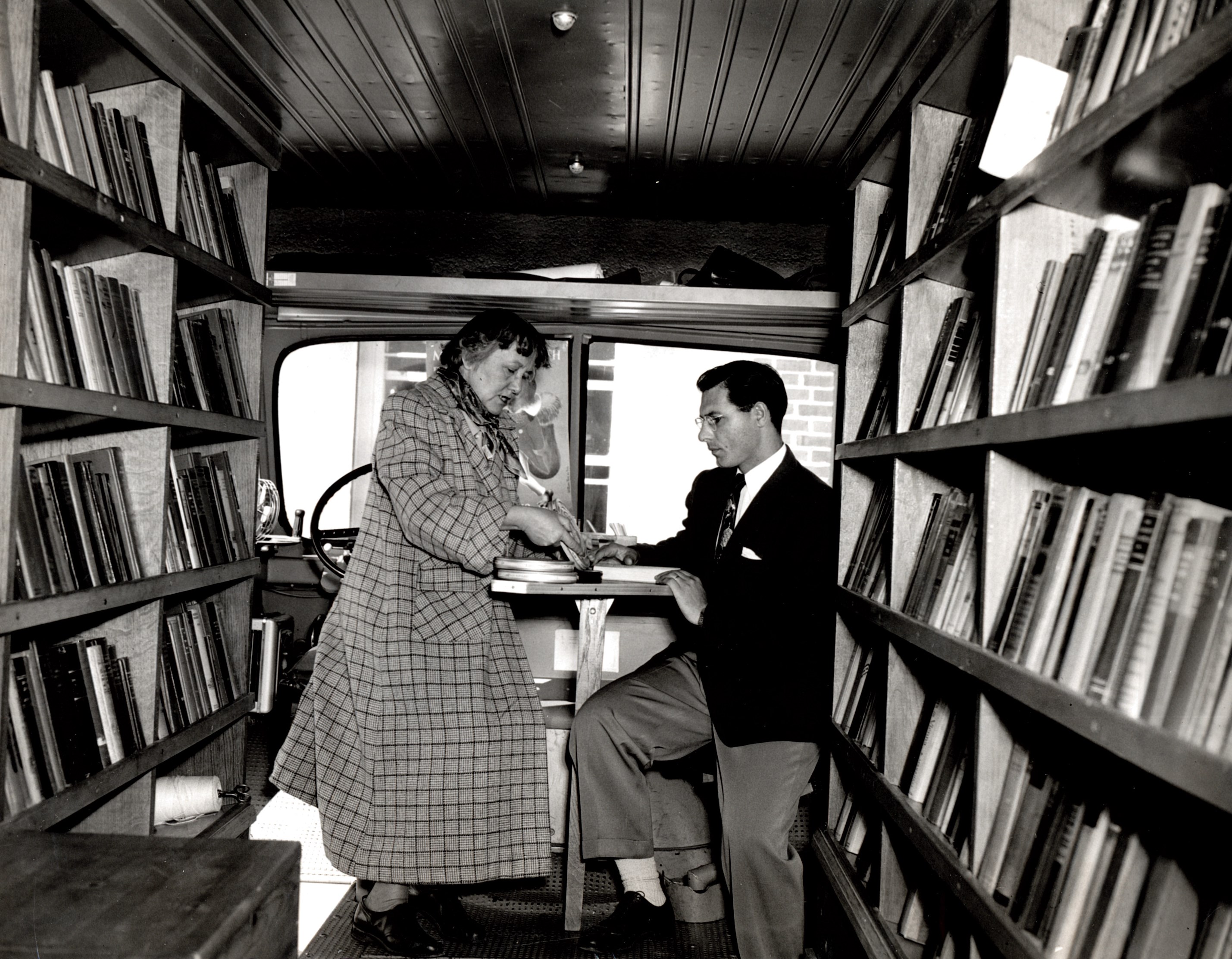 Back of Photo: " Edith Smith helps Michael Cherello, Principal of Cedar Knolls School select his films in the bookmobile." Dated "1954?"