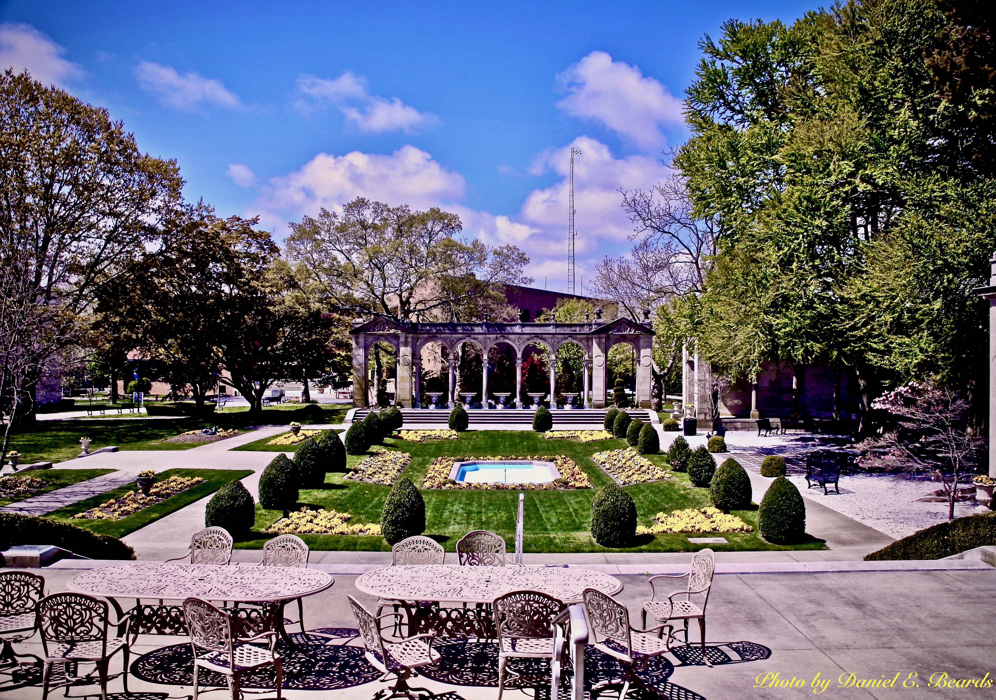 Renowned French landscape architect Achille Duchene designed the formal gardens to the west of Wilson Hall.A p�ristyle, or covered colonnade, encloses one side of the gardens. A �water organ� fountain, which is modeled on la Colonnade at Versailles, forms the boundary on the west side.