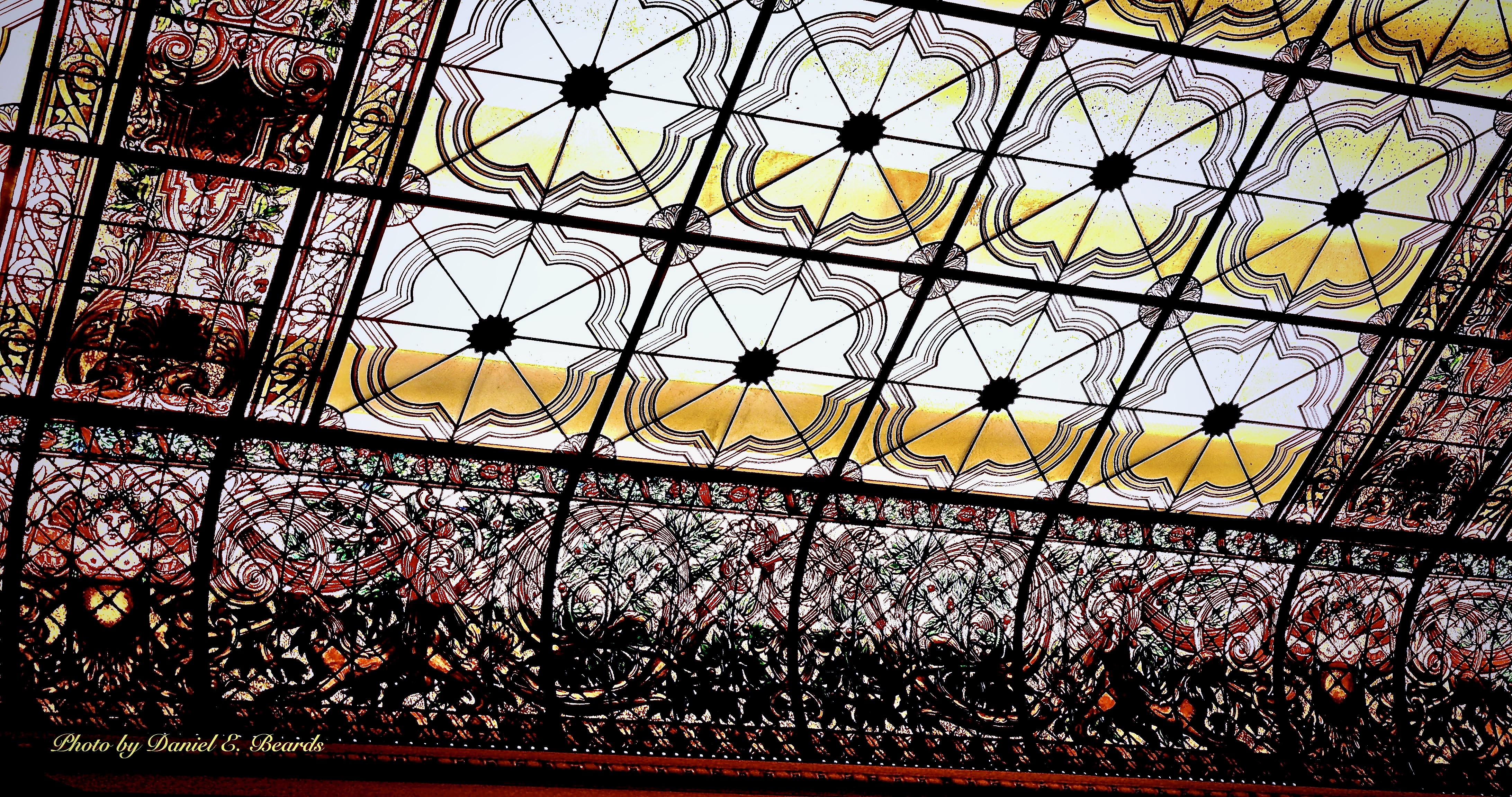 One of the most impressive ceilings from the Gilded Age/1920s. The sun lights the colorful ceiling during the day, but at night 165 bulbs illuminate the magical window.