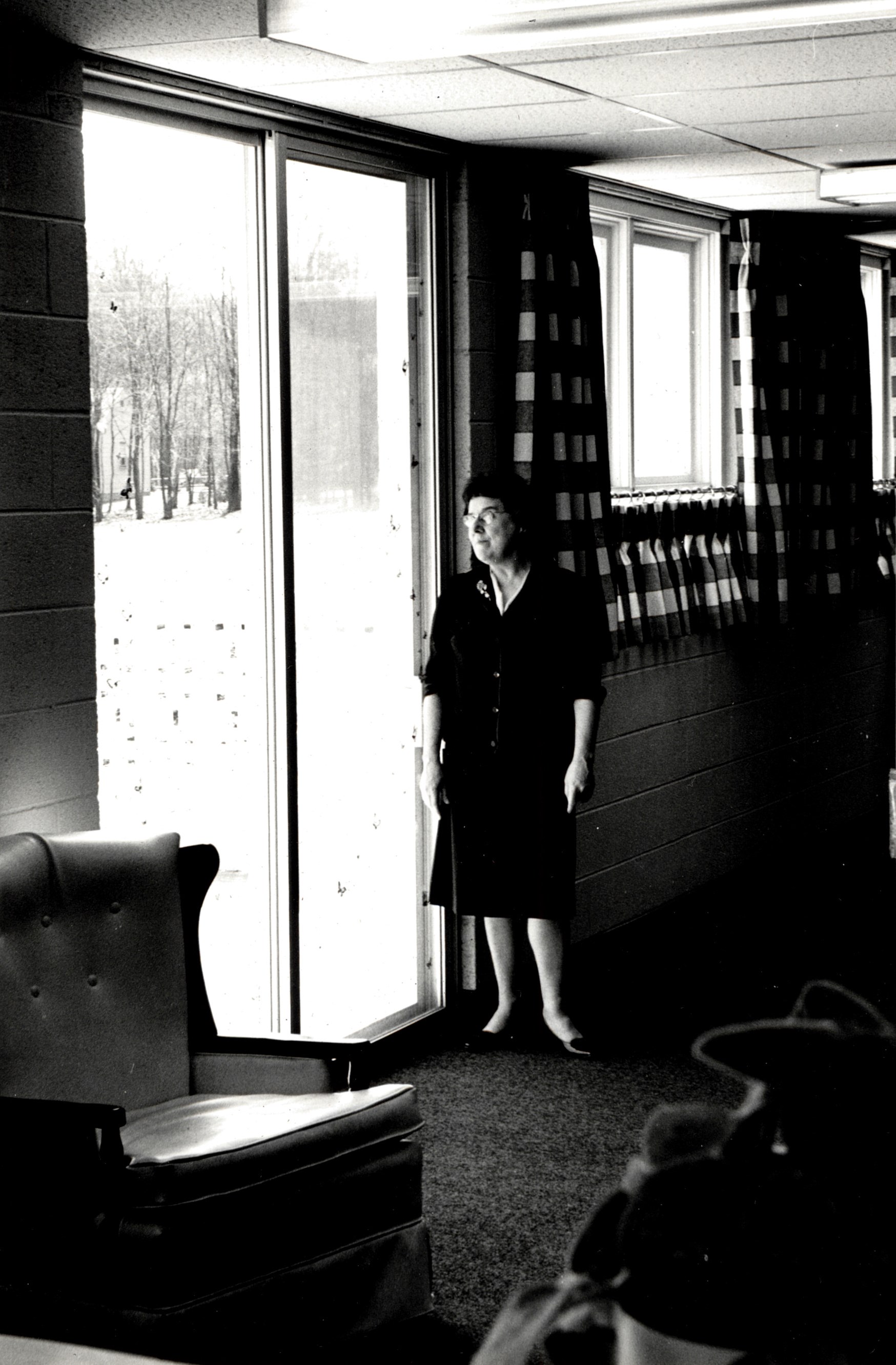 Back of Photo: "Mrs. Wrathall, sliding glass doors to patio - Children's Room." Date unknown.