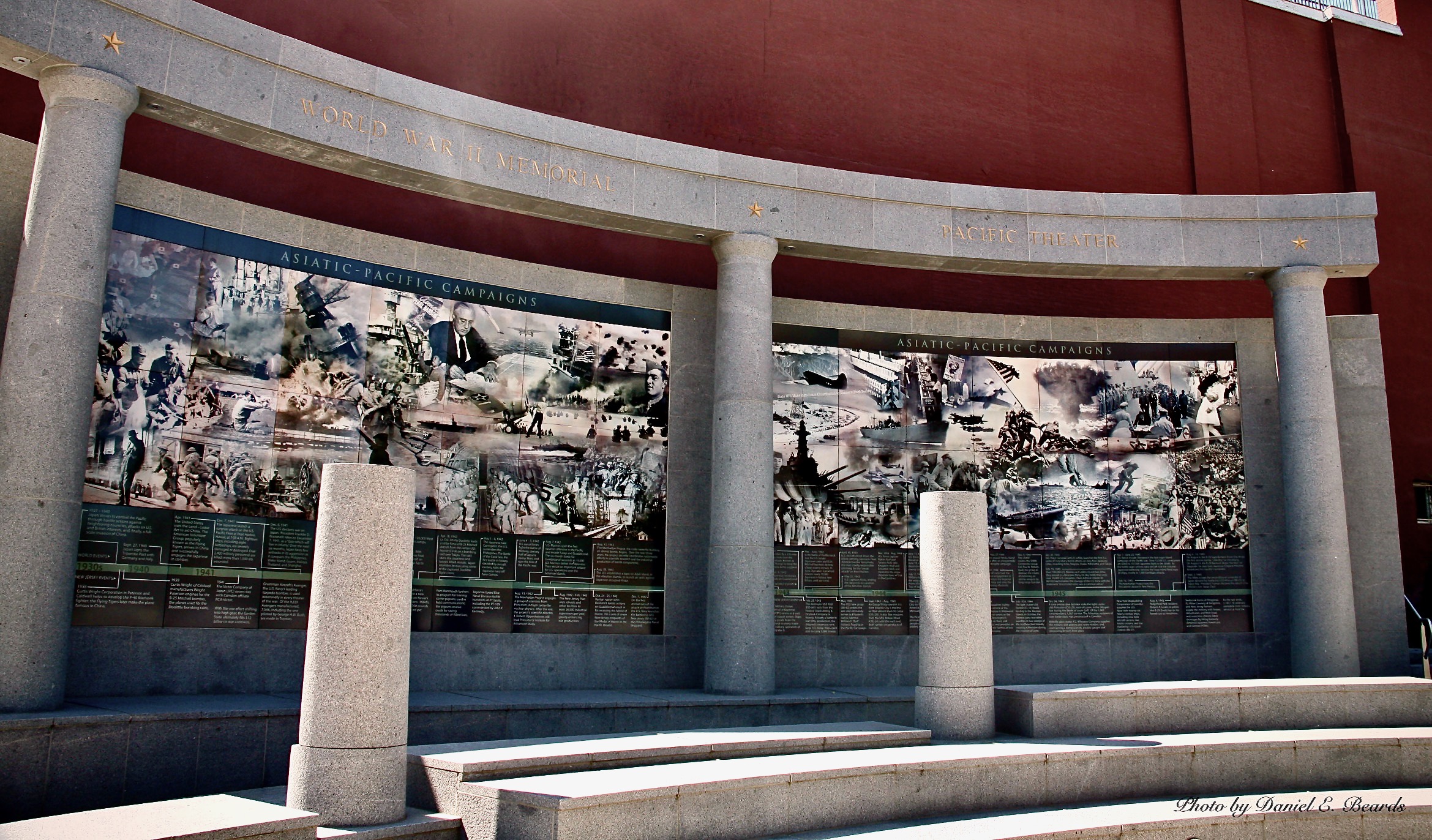 The New Jersey World War II Memorial contains two granite story walls, measuring 12 feet high by 40 feet wide.