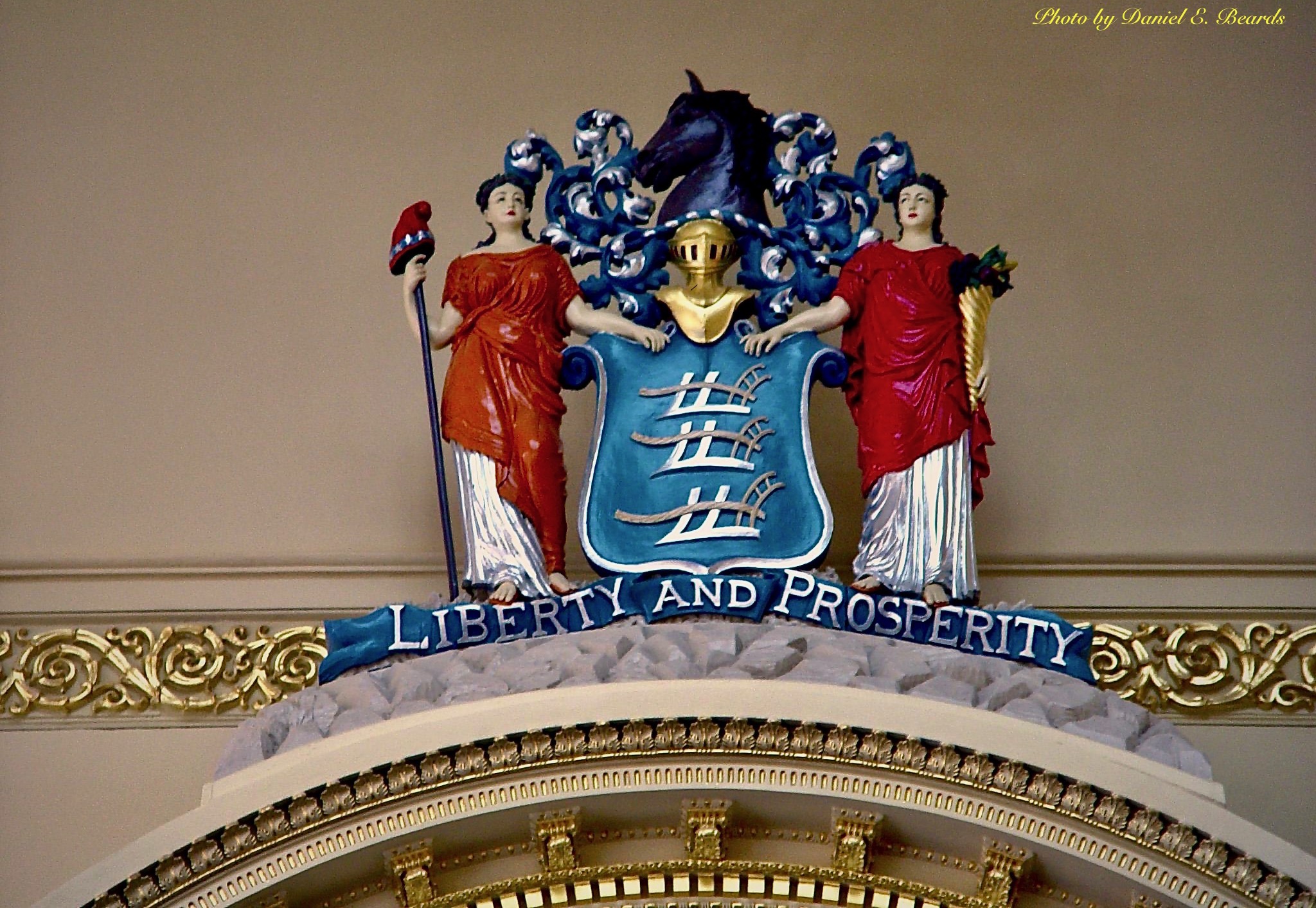 Above the Assembly Speaker's dais is The Great Seal of the State of New Jersey