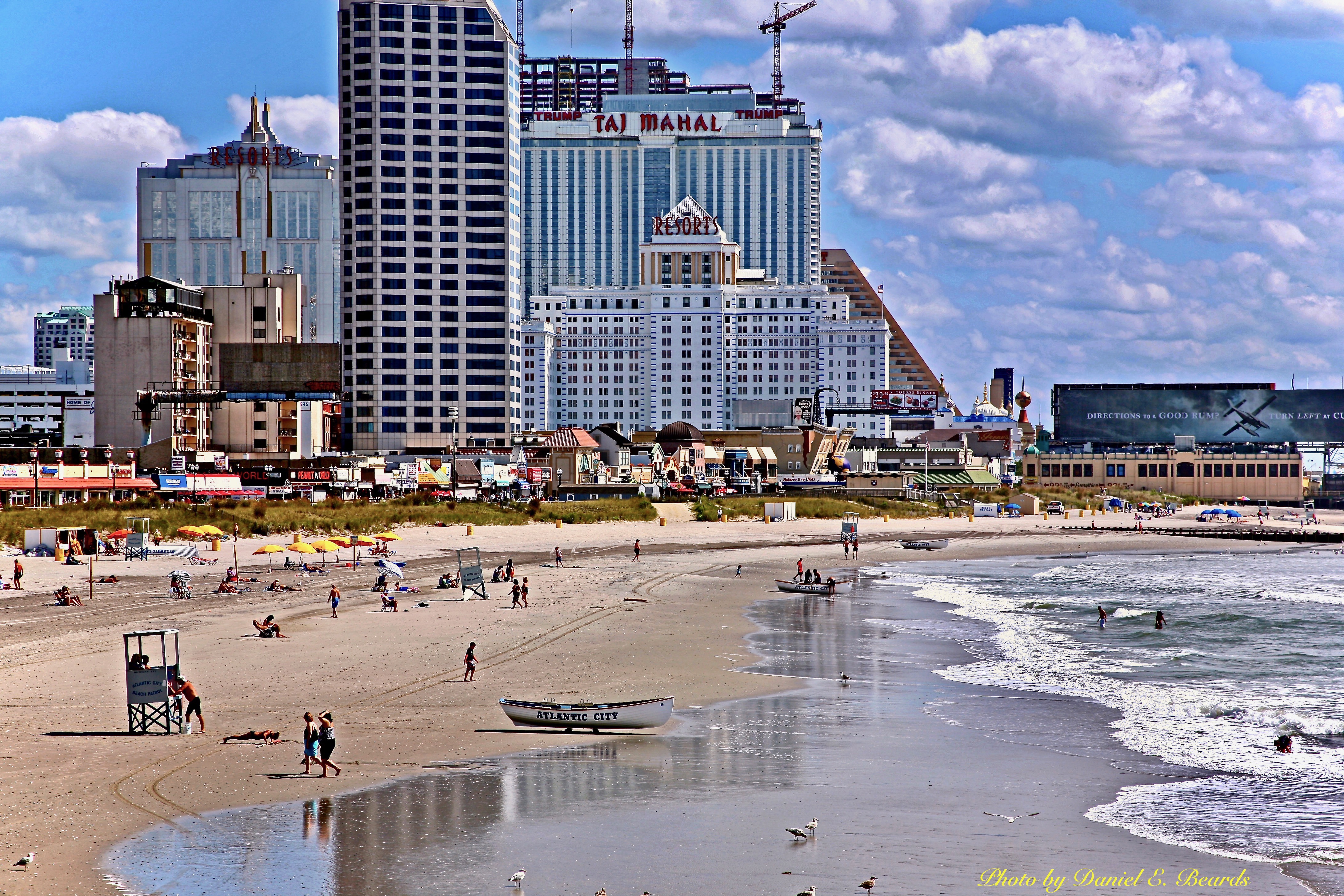 This picture shows people enjoying the beach in Atlantic City while the large hotels and casinos provide the backdrop.