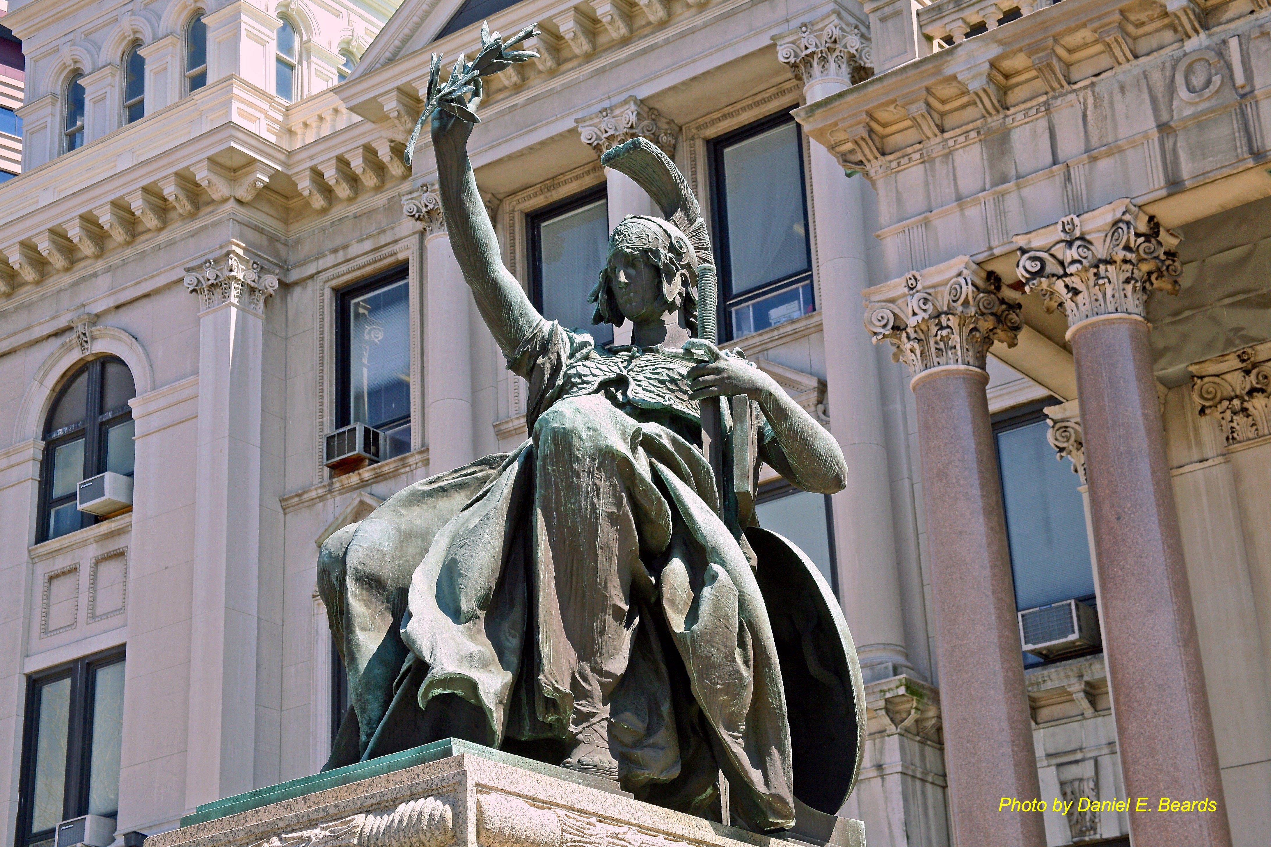 The city later wanted a statue built outside the building to enhance the exterior design. The statue was to serve as a Civil War Memorial. The city held a competition to find an artist to create the statue. The winner was Philip H. Martiny, who was a student of Augustus Saint Gaudens. Gaudens sat on the panel that was in charge of selecting the artist. Martiny's design for the statue included a seated female who was inspired by the Roman goddess Bellona.