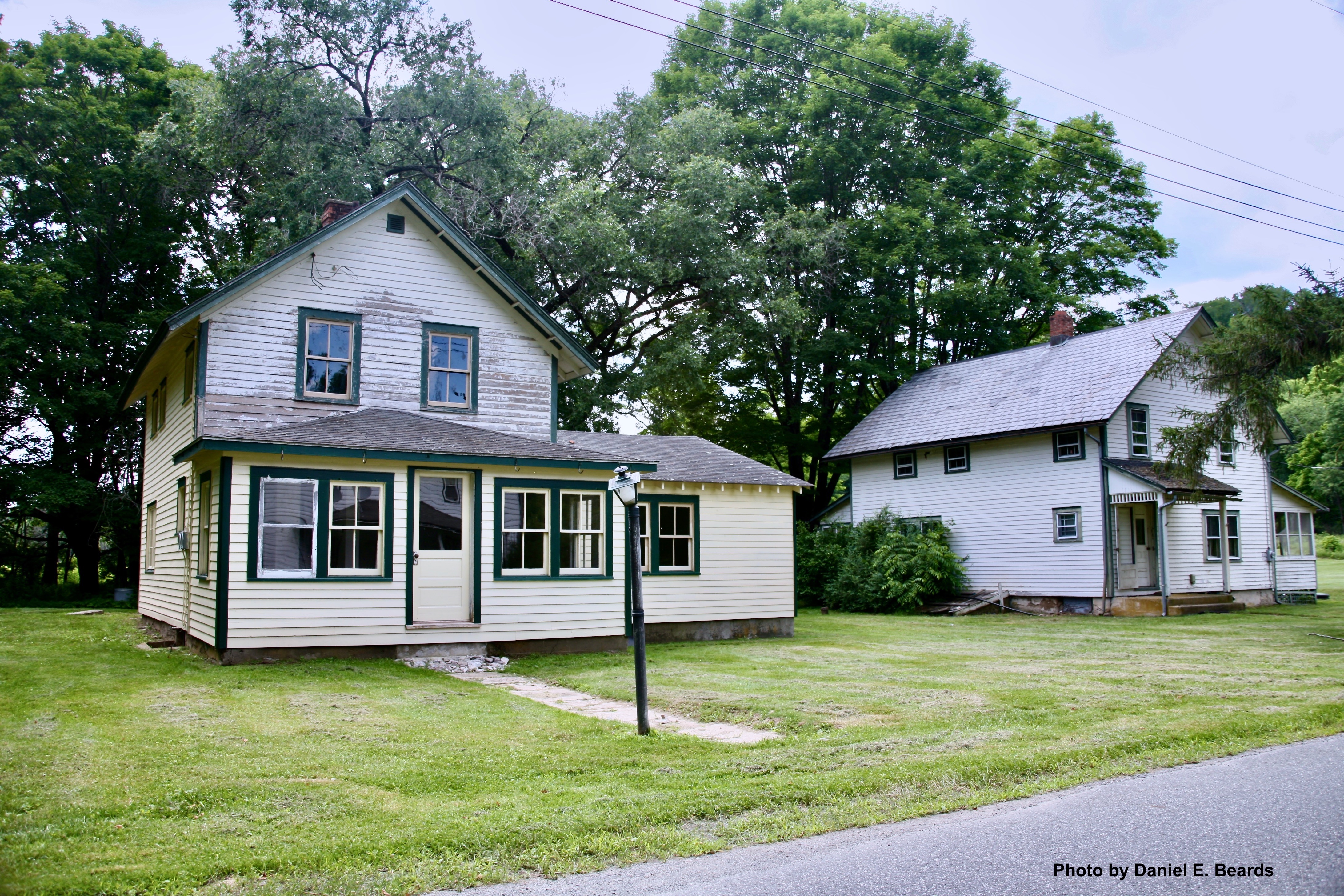 On the right is the Hendershot House. It is a two-story house on a concrete foundation. The style of the home, with its slate shingles, white clapboarding, and dark green trim, is consistent with the other homes in the village.
