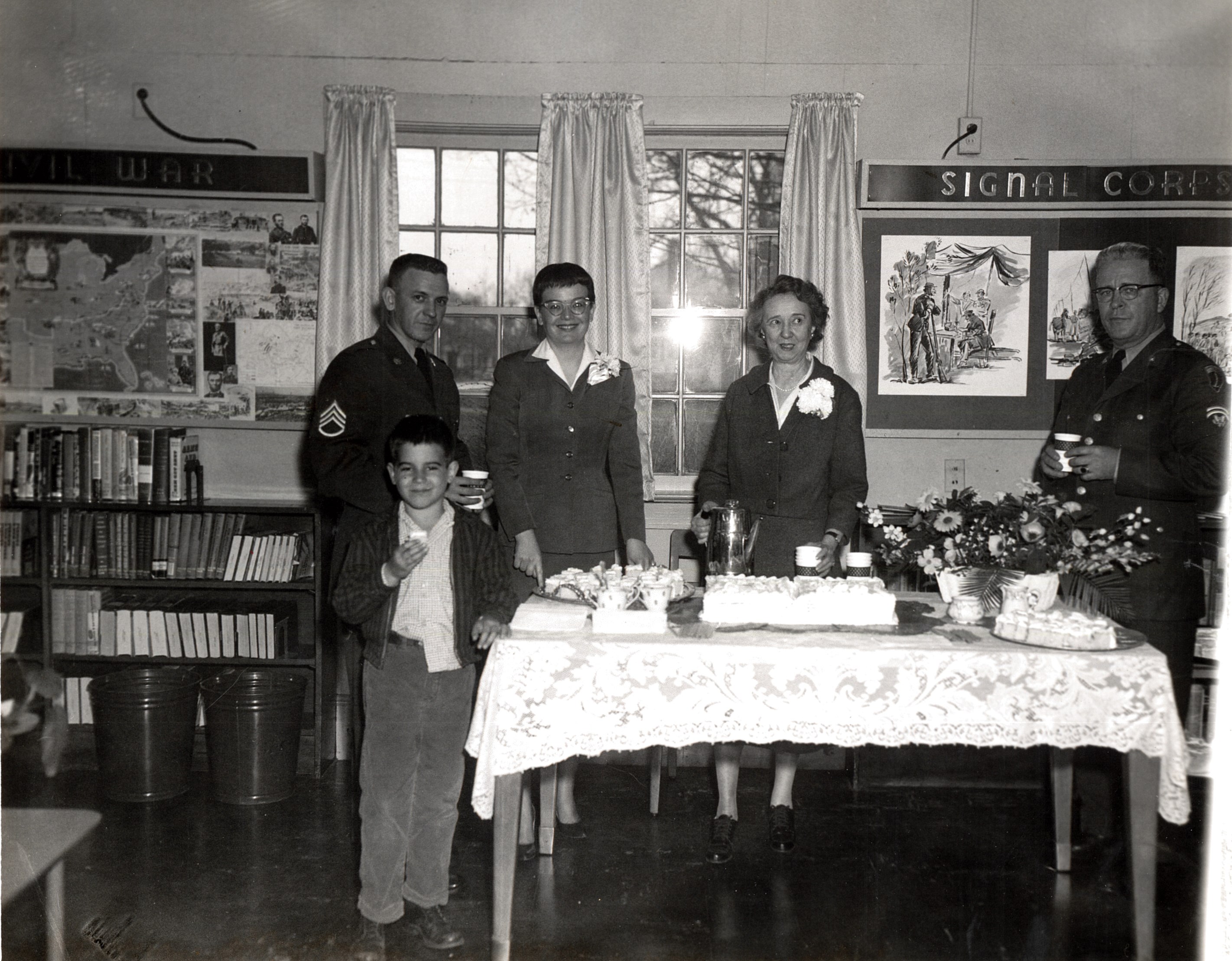 Back of Photo: "Picture taken at Open House held during National Library week at the Fort Monmouth Special Services Post Library. Miss Marjorie Longstreet, hospital librarian pours coffee for Miss Arlene Hahn, assistant post librarian and David Goodrich, son of Col. and Mrs. Raymond Goodrich. (Two Sgts. can't be identified). Photo by Joseph Mangogan of Special Services.