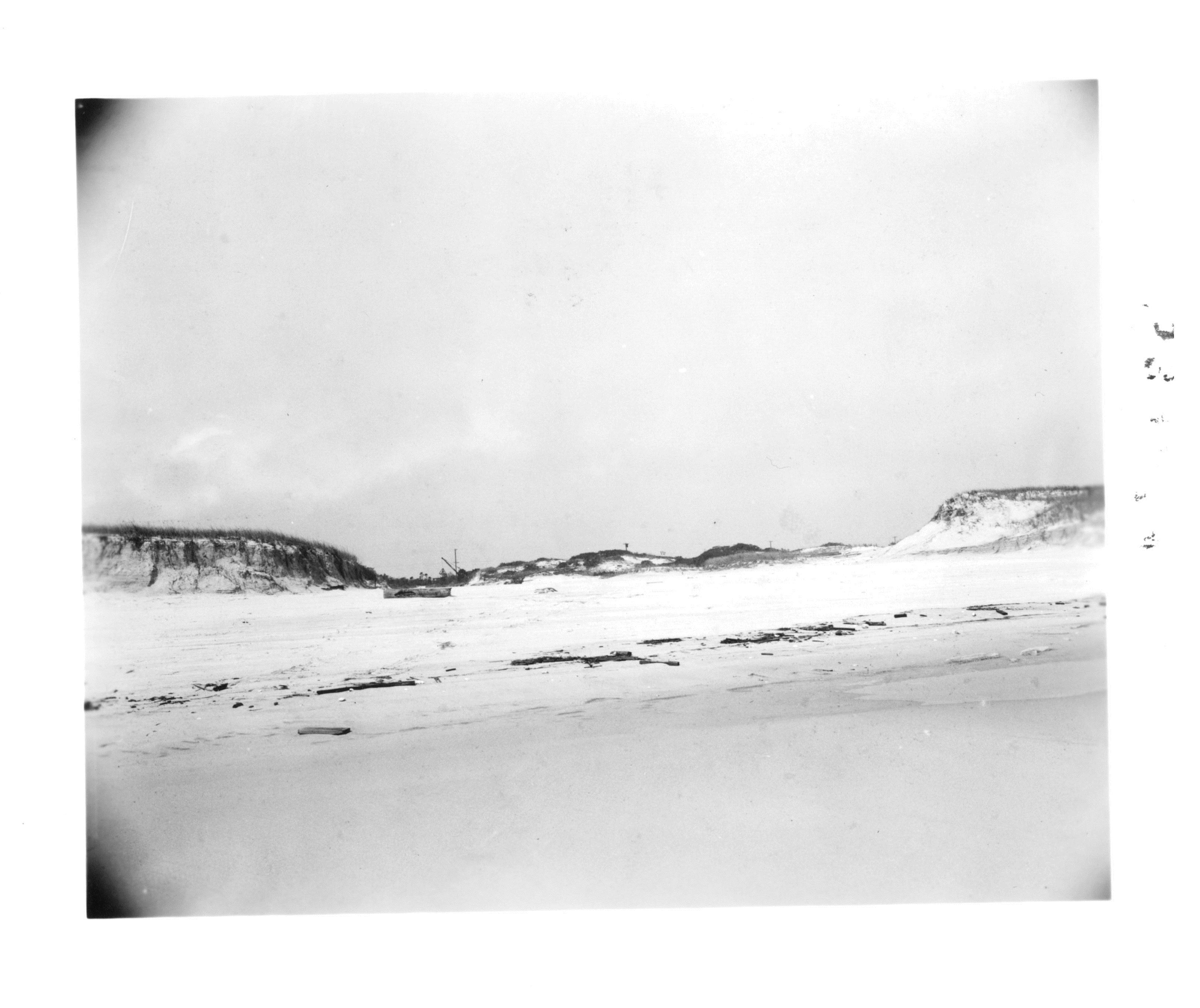 Reverse of Photo: Break through 15 foot sand dune, which caused wash in road. 5 miles below Island Beach Gate, Island Beach, N.J.
