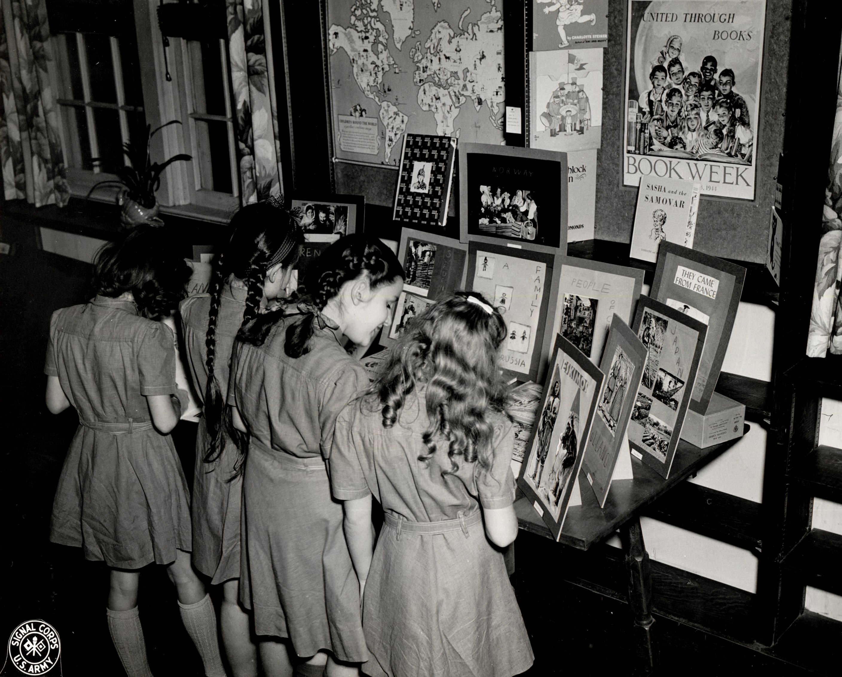Back of Photo: "Brownie Scouts, Book Week, 11/13/44. Looking over exhibit which the Brownies prepared – subject “The United Nations.”