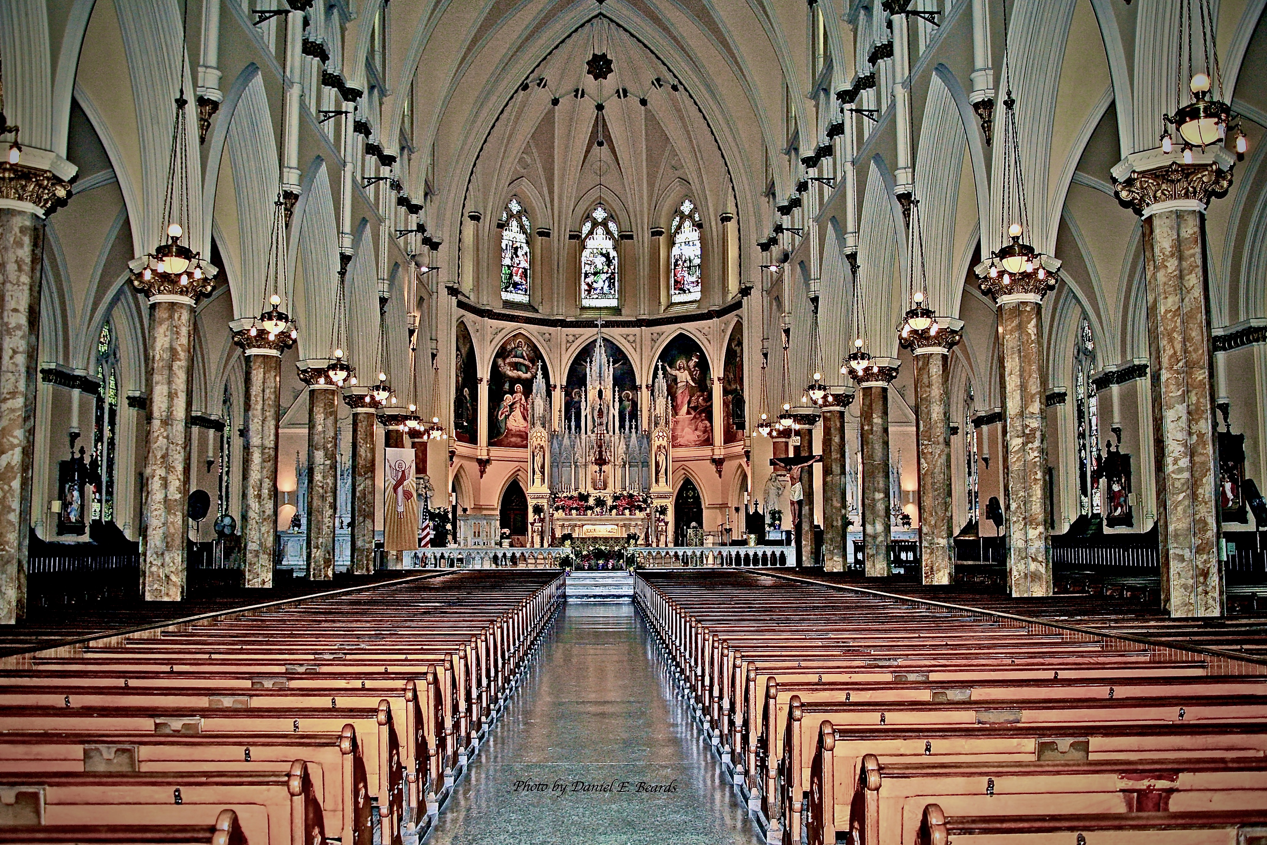 The interior of this Gothic church features ribbed vaulting, with sixteen granite columns supporting the clerestory walls, a nave of 86 feet, side aisles, a chancel, side chapels, woodwork of black walnut and white ash, and stained-glass windows, but has no transept.