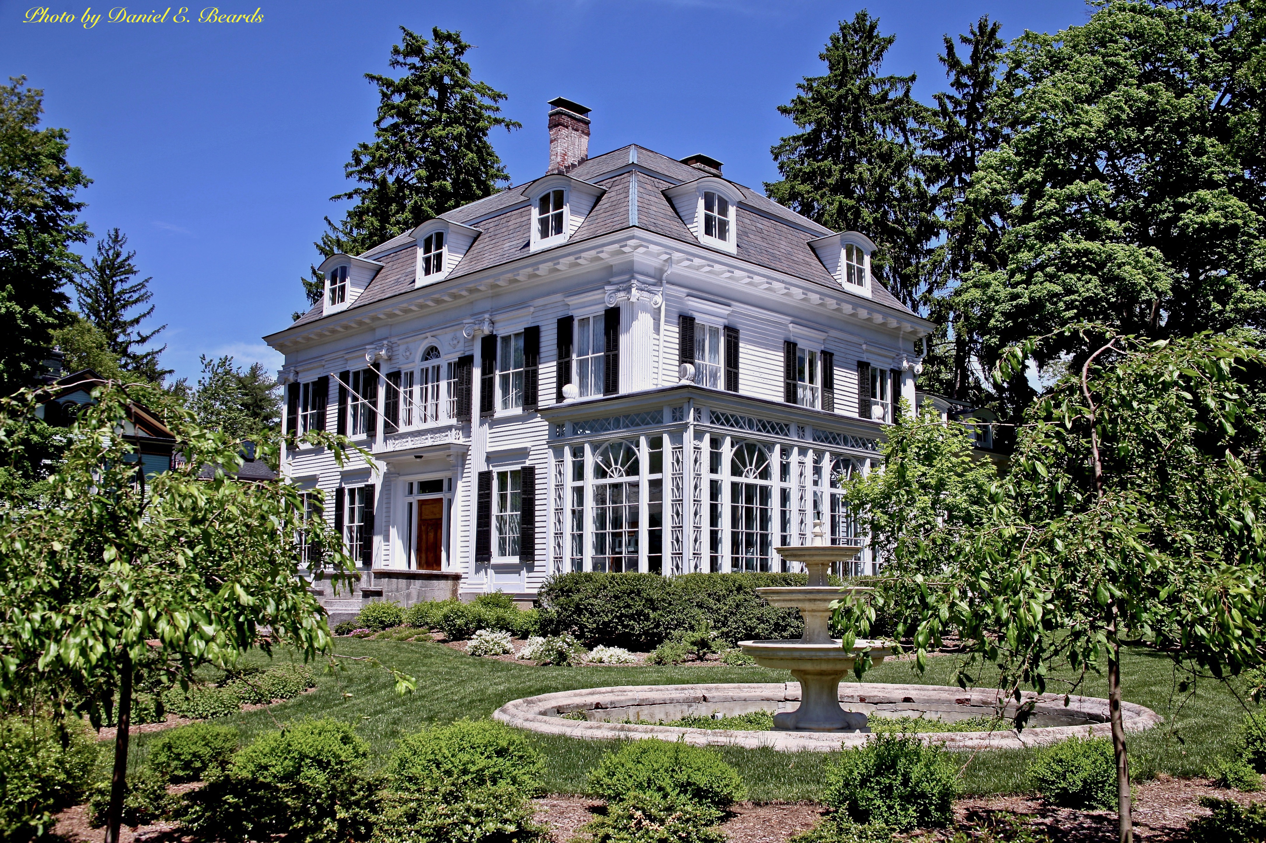 | dc.description | This wood-frame structure has a mansard roof and clapboard exterior. It is a fine example of Second Empire architecture, with pilastered corners, bracketed cornice, and curved-roof dormers in the attic level. It was by Mark Twain and President Grant. Today it is a private home. | |